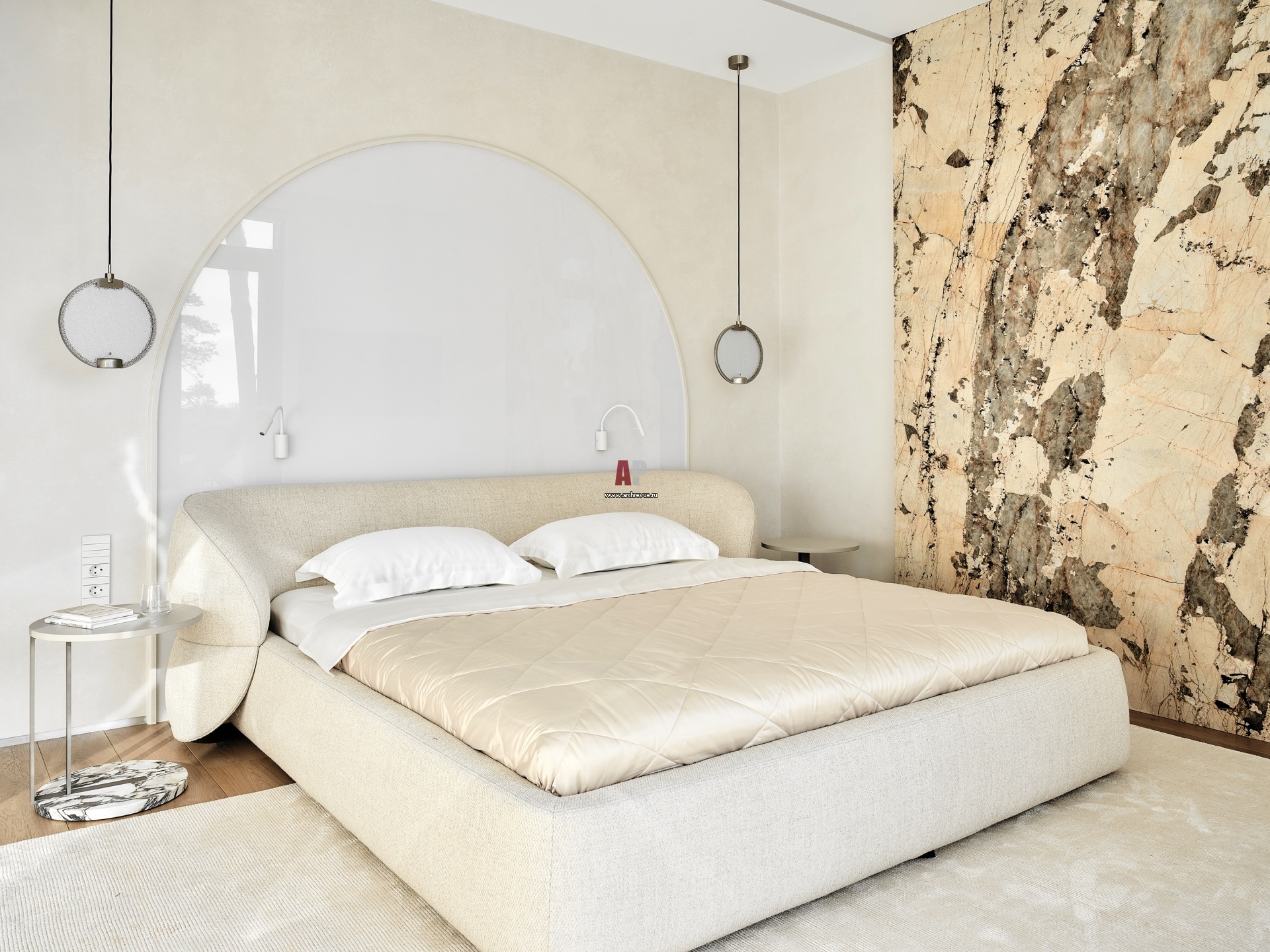 Спальня – спокойное, гармоничное и одновременно роскошное помещение. Стена из мрамора Patagonia в вечернем свете излучает мягкое свечение.