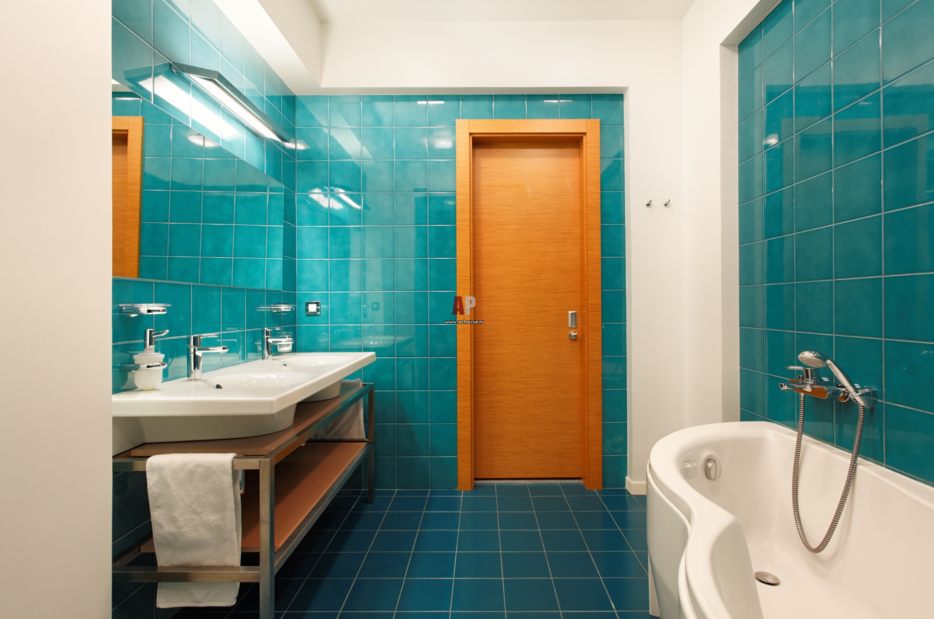 Двери в детский санузел выполнены из того же шпонированного дерева, что и стеновые панели, библиотека, волнообразная перегородка. Производитель всех этих изделий – столярная мастерская «Александр Ней».