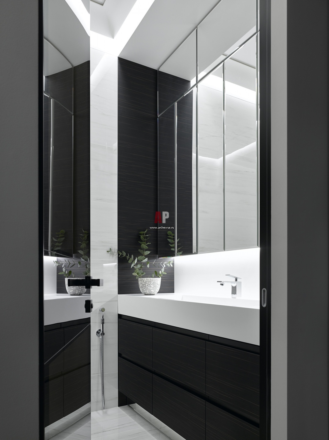 Ванная комната в черно-белой квартире. Небольшое пространство увеличивают зеркала. Умывальник выполнен из того же дерева, что кухня и стеновые панели в спальне.