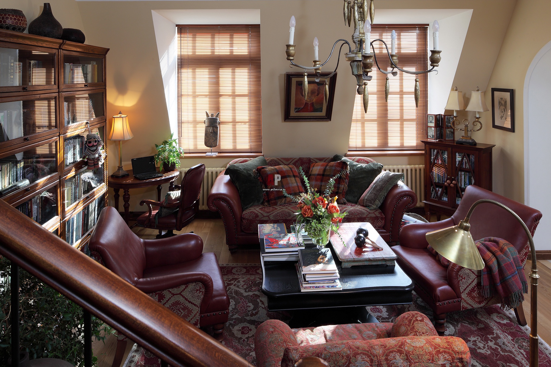 Уютную обстановку в квартире создает коричнево-красное дерево (оконные рамы, ступени и перила лестницы, половая доска) и красный текстиль (обивка кресел, ковер). А также предметы из семейной коллекции: картина Шемякина, графика Майорова, Лапкусова и Стейфина.