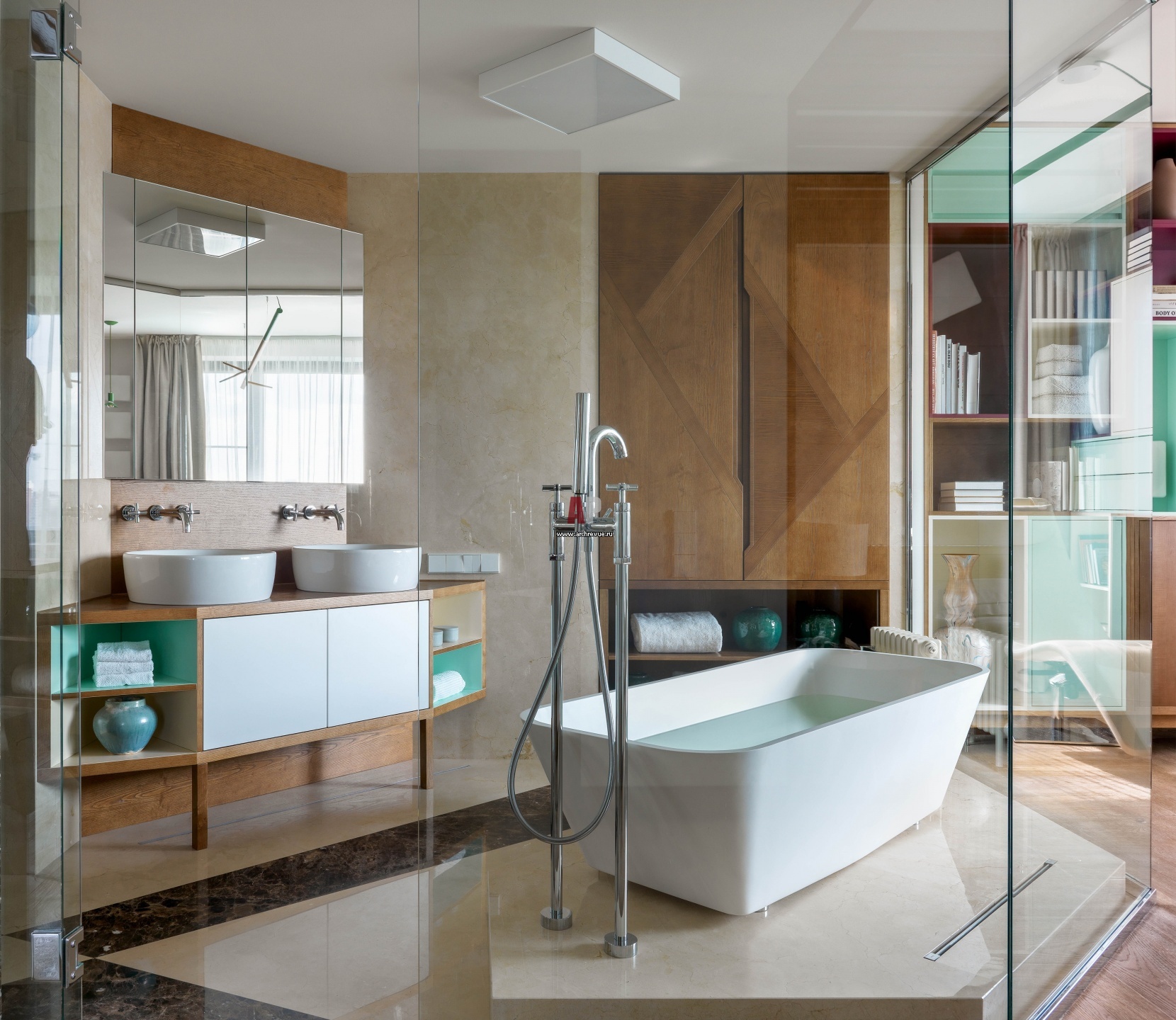Мокрая зона с отдельно стоящей ванной выделена стеклянными панелями и интегрирована в спальню. Ванна, Edone. Смесители, M&Z Rubinetterie. Тумба под раковину и шкаф сделаны на заказ.