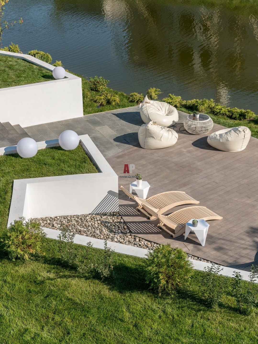Фото ландшафта. Сад террасами спускается к искусственному водоему.