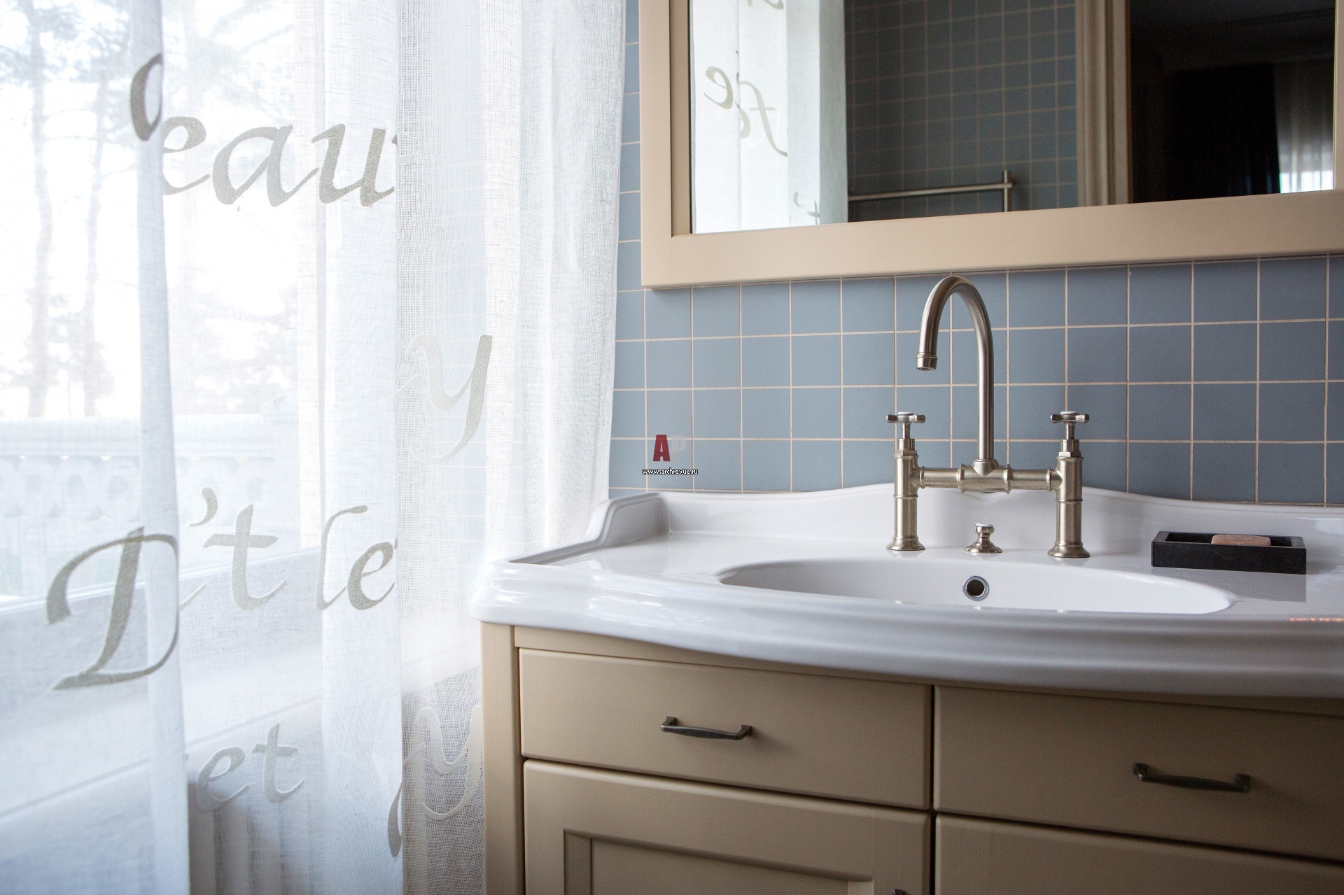 Обе спальни второго этажа сделаны проходными, они объединены со своими ванными комнатами и гардеробными. Смеситель, Axor, серия Montreux. Тюль со шрифтами, Mastro Raphael.