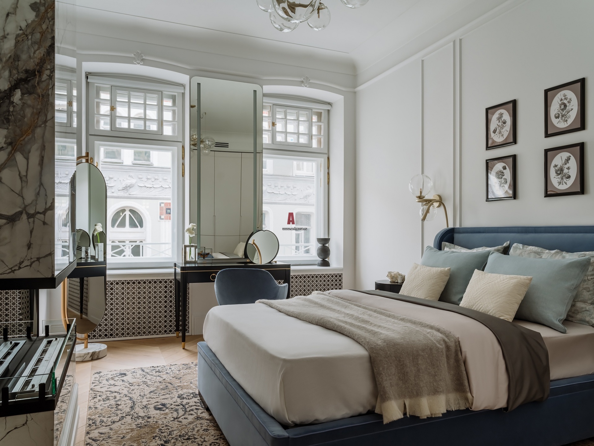 Детская спальня с камином. Кровать и стол, Galimberti Nino. Стул, Sovet Italia. Люстра и бра, Vistosi.