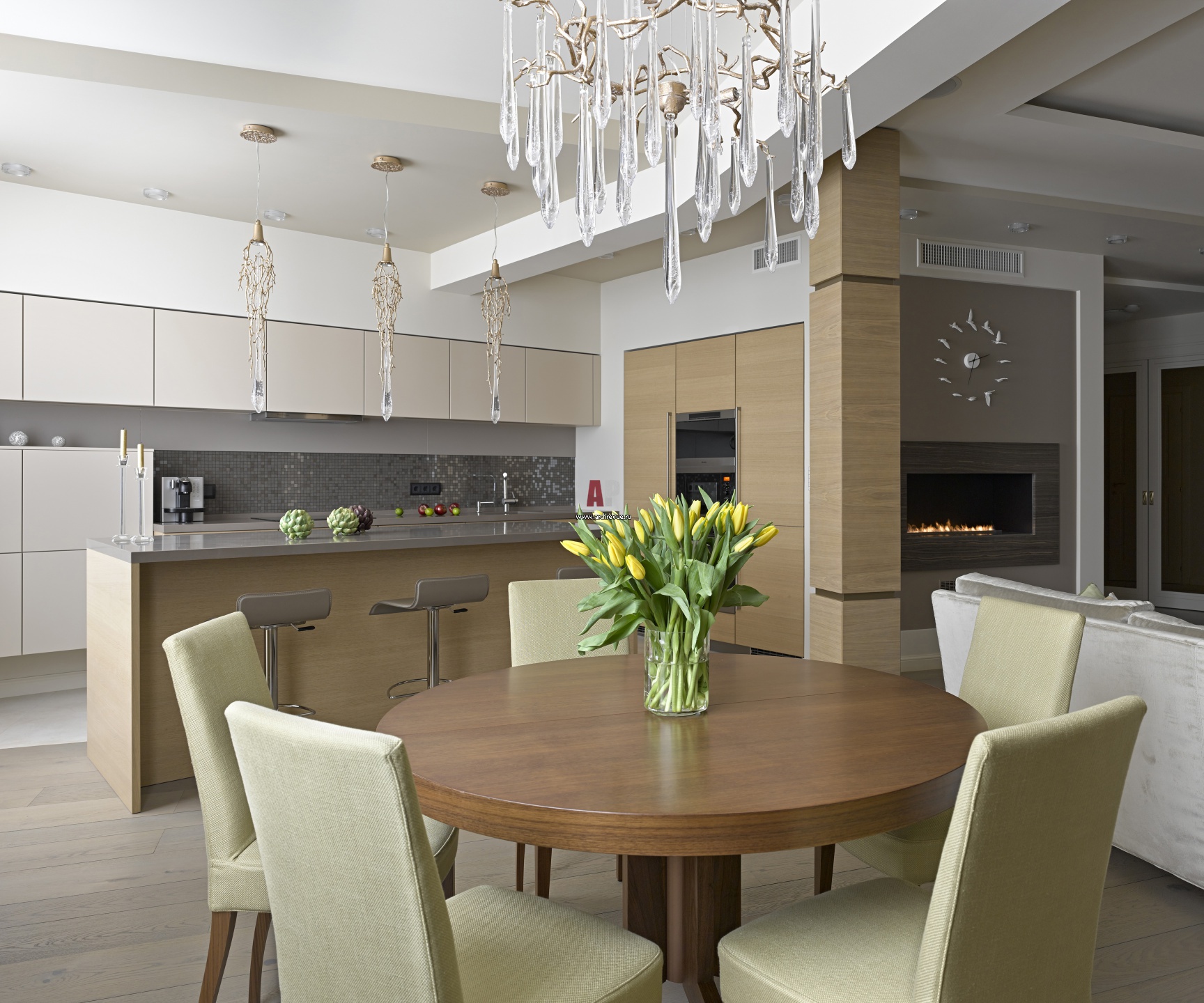 Фото интерьера кухни-столовой. Пол - паркетная доска, коллекция Piet Boon, дизайнер П. Бон, Solidfloor, оттенок Sand, цвет «седой дуб». Кухня, Leicht. Обеденная группа, Porada. Барные стулья, Emmei. Серия подвесных светильников над островом, Serip.