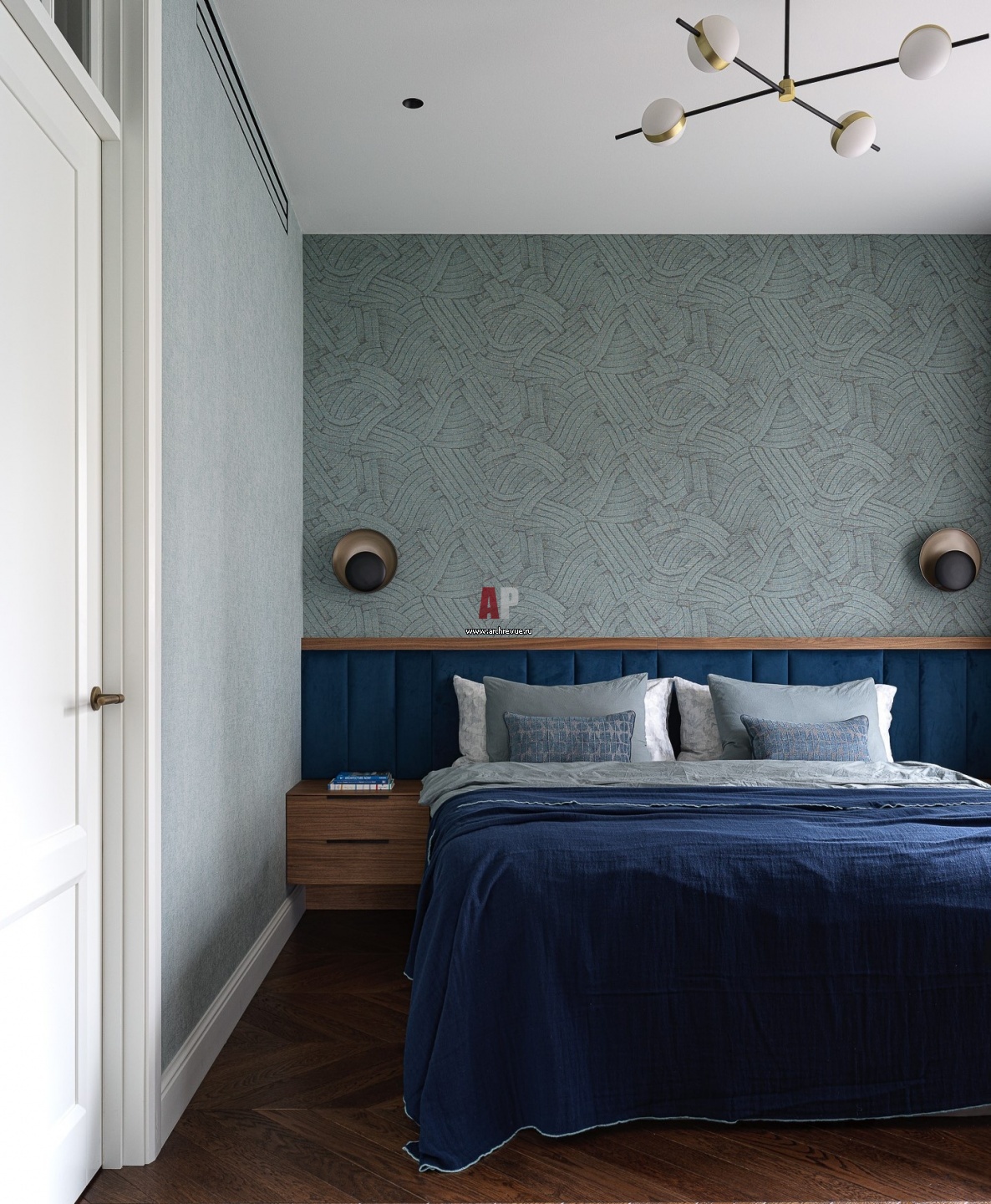 Хозяйская спальня. Обои, Arte. Матрас и основание кровати, King Koil. Изголовье кровати насыщенного синего цвета и прикроватные тумбы, на заказ, по эскизам бюро.