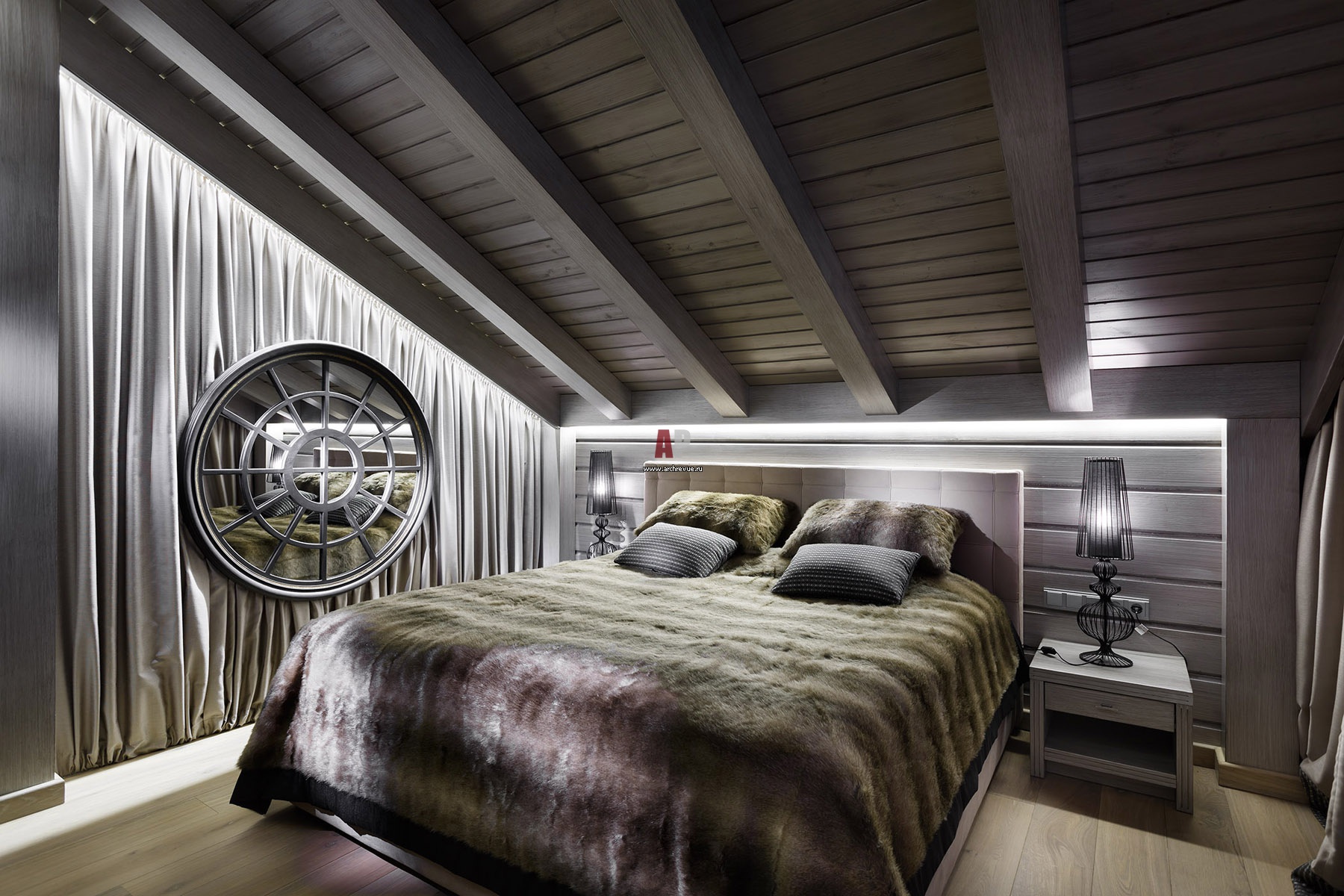 Стены и потолок в спальнях деревянные. Частично они задрапированы тканью, на которой размещены зеркала. Кровати убраны меховыми покрывалами.