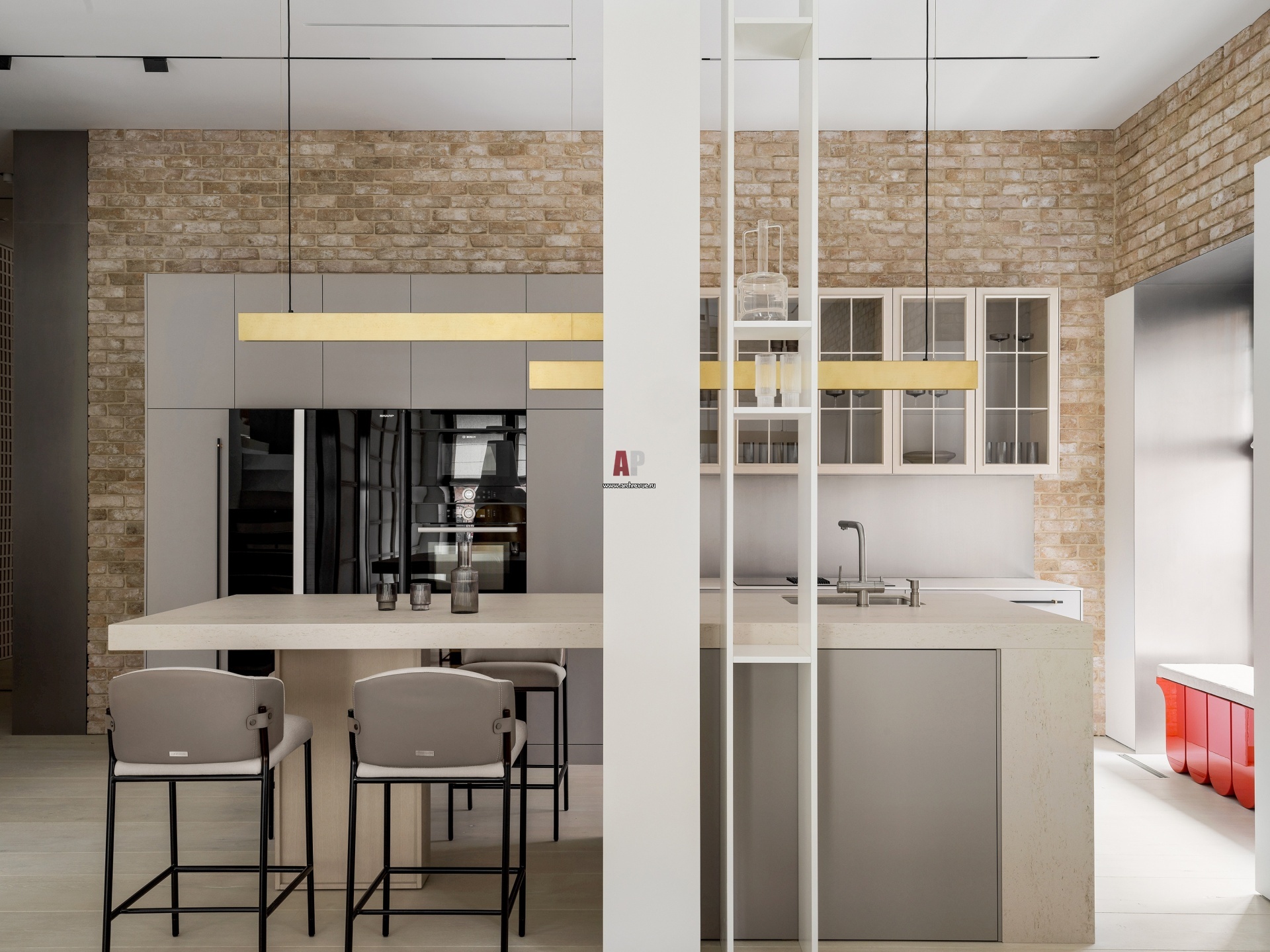 Кухня Modulnova в покрытии Fenix. На фартуке панель из нержавеющей стали. Подвесные шкафы из шпона дуба и открытый стеллаж разработаны по эскизам. Барные стулья, Formitalia, коллекция Aston Martin, модель V242. Подвесные декоративные латунные светильники, Baxter, модель Blade.