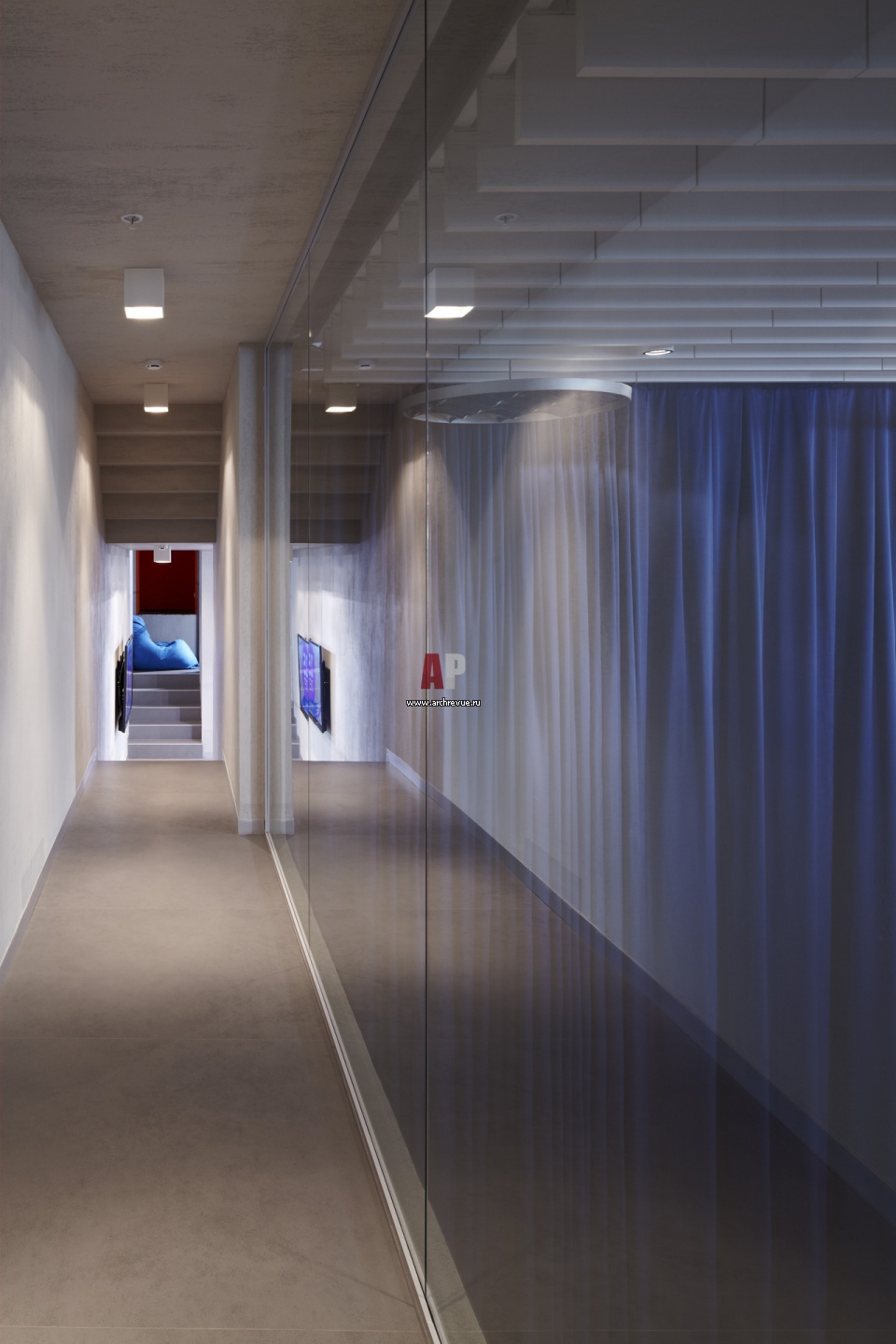 Интерьер холла. Стекло и акустические материалы – основные декоративные акценты офиса.