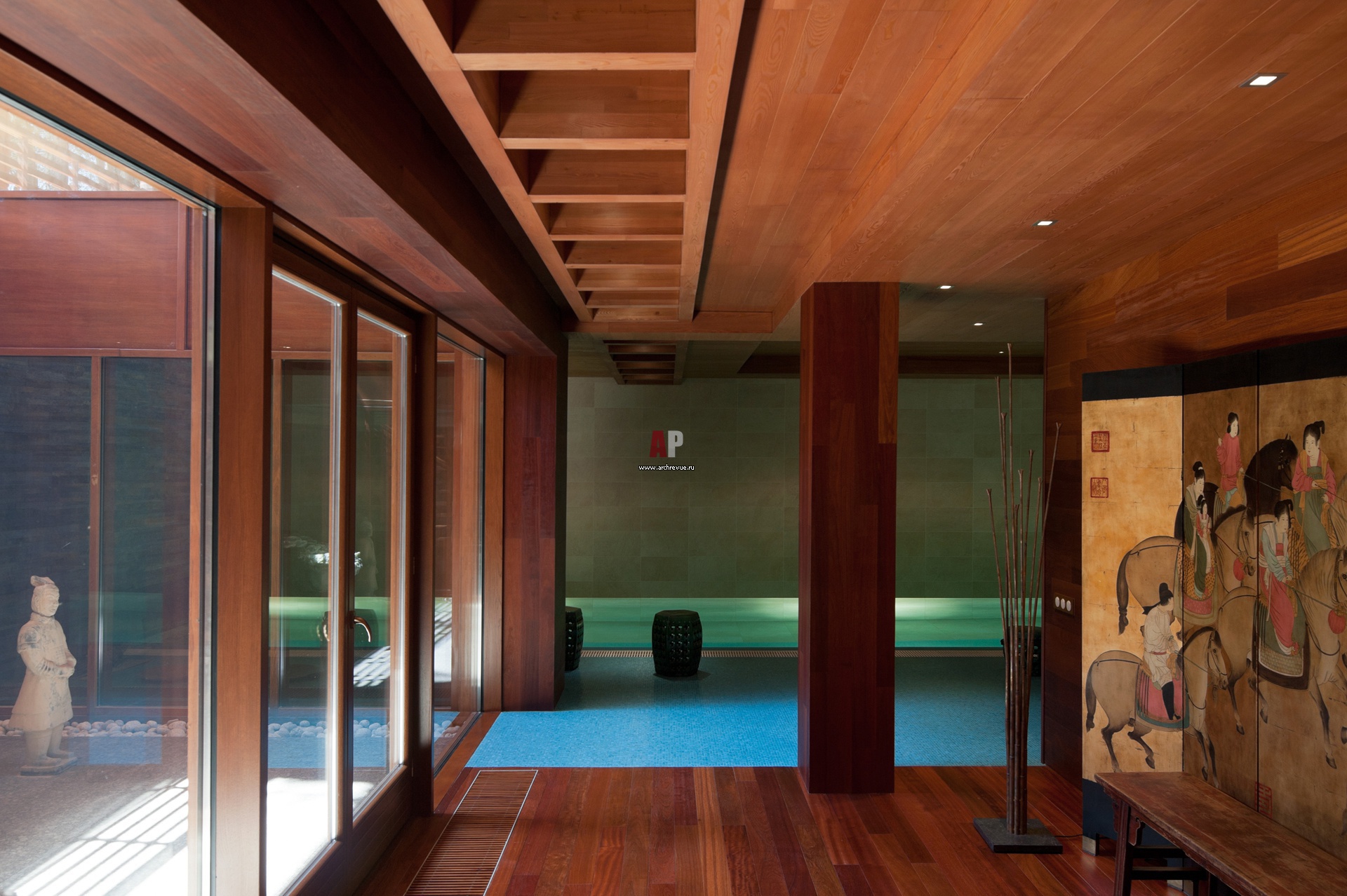 Бассейн имеет выход в небольшой внутренний двор. К нему примыкает зона SPA с сайноу и гидромассажем. Китайская ширма с изображением конных воинов – антиквариат.