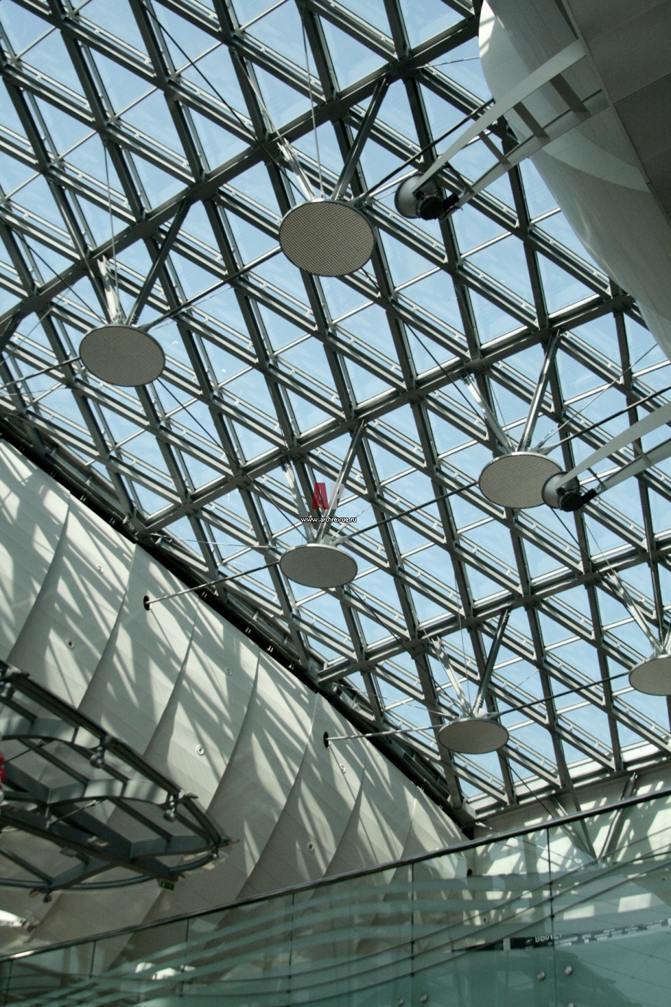 200-метровая «лебяжья шея» фасада переходит в здание терминала с крышей в виде купола-полусферы.