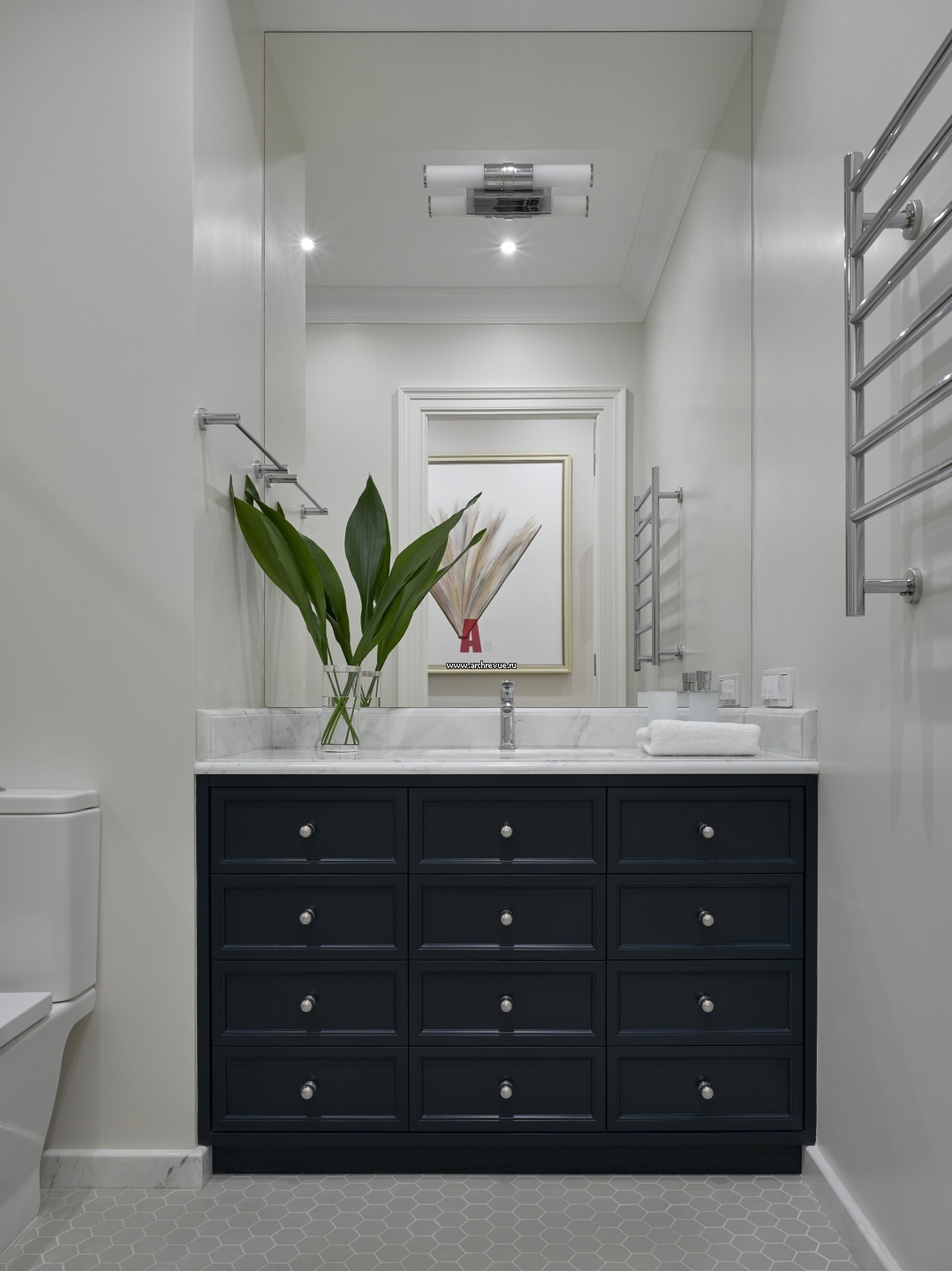 Монохромный интерьер санузла квартиры в красках природы. Плитка настенная, Ceramica Vallelunga. На полу – английская плитка, Devon & Devon. Бра, Robert Abbey.