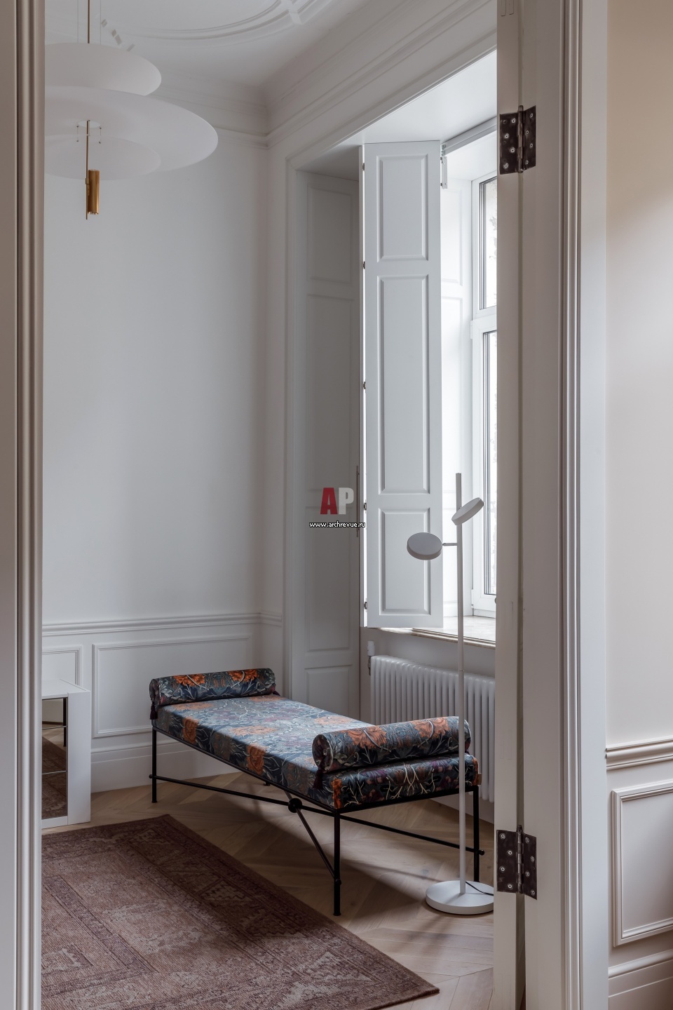 Реконструкция квартиры с неоклассическим декором. Кушетка, Svetlana Vlasenko. На окнах – деревянные ставни.