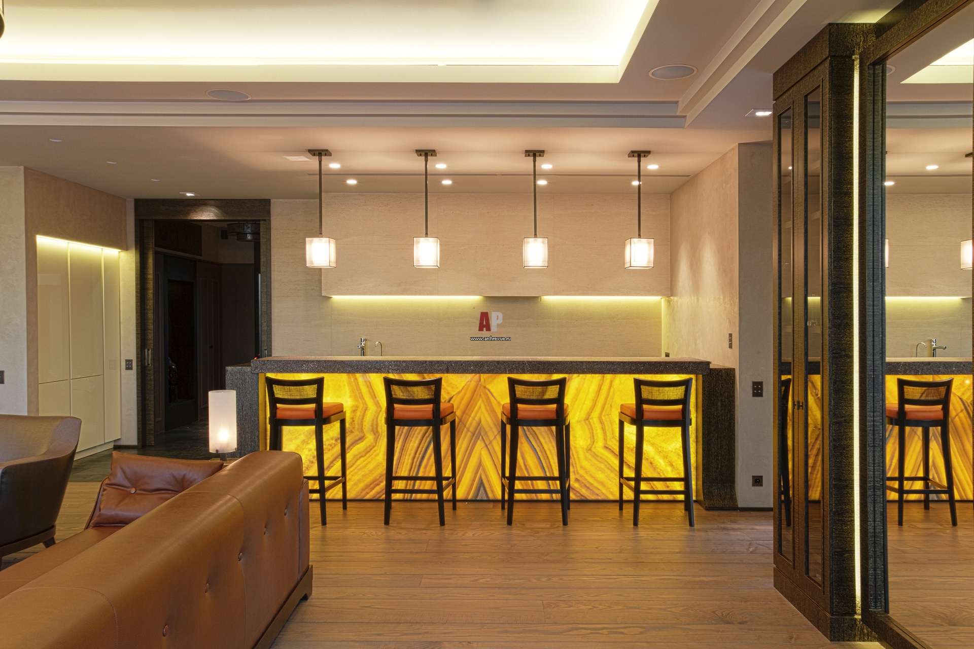 Интерьер гостиной с барной стойкой. Барная стойка выполнена из янтарного оникса подсвеченного изнутри.