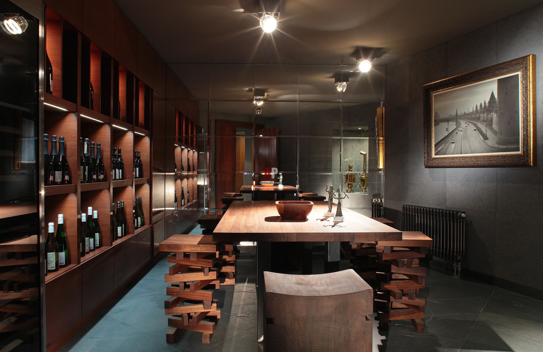 В винном погребе встроенные шкафы сделаны на заказ, изготовление «СОФИЯ-ДЕКОР». Стол и табуреты, Riva 1920.