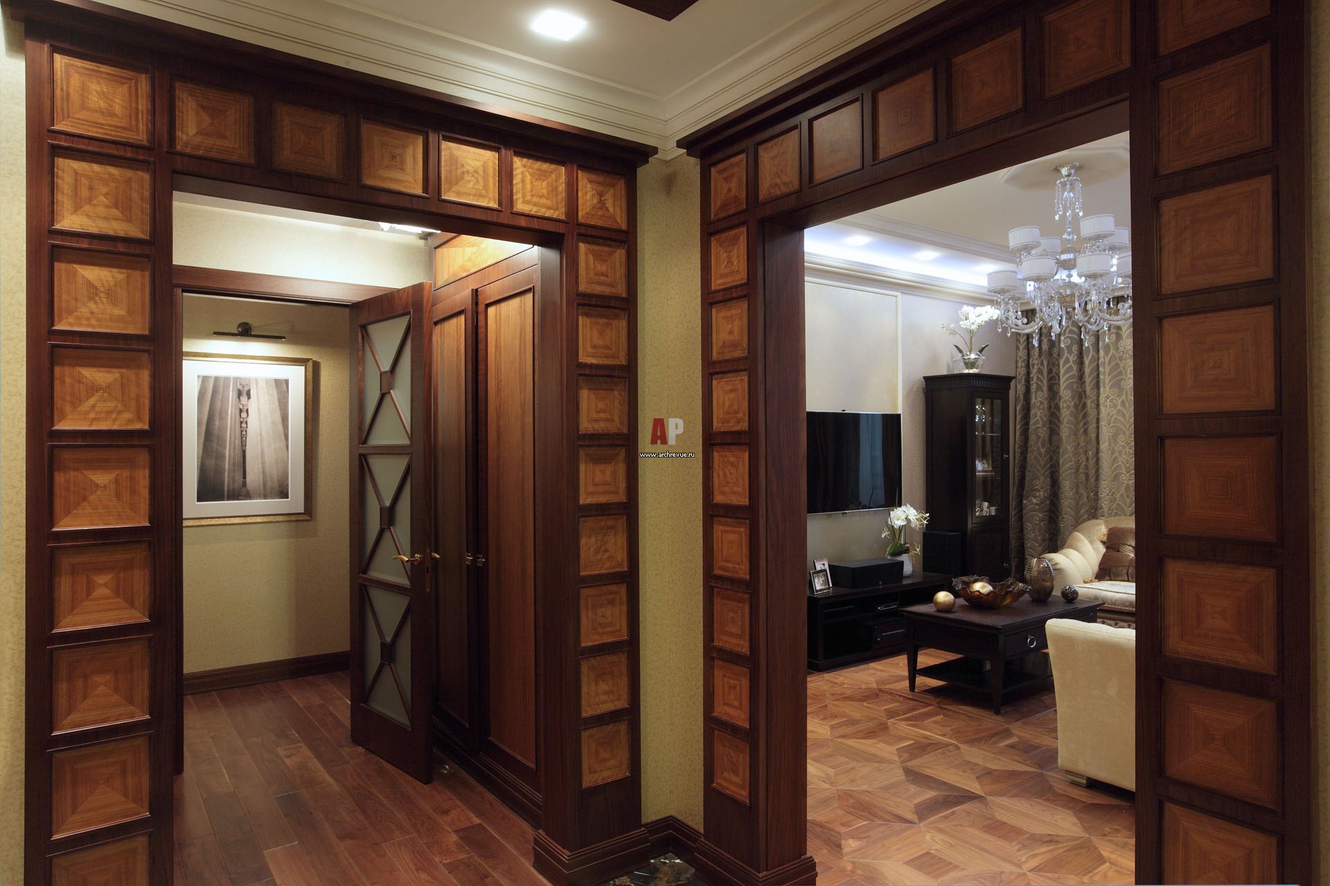 Широкие дверные проемы обрамлены порталами с геометричным рисунком в духе стилистики ар-деко из дуба и ореха.