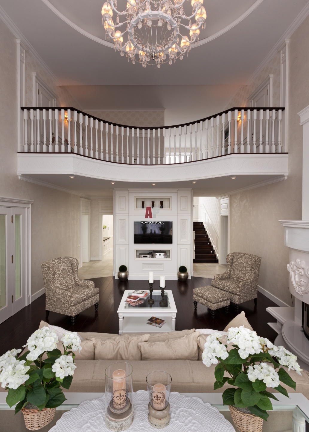 Интерьер гостиной строится на контрасте светлых плоскостей стен и фурнитуры мебели и полов насыщенного шоколадного цвета. Обрамление зоны домашнего кинотеатра выполнено на заказ, дерево, светлая эмаль, патина. Оборудование домашнего кинотеатра, Epson, Bowers&Wilkins – официальный дистрибьютор A&T Trade, Bekker.