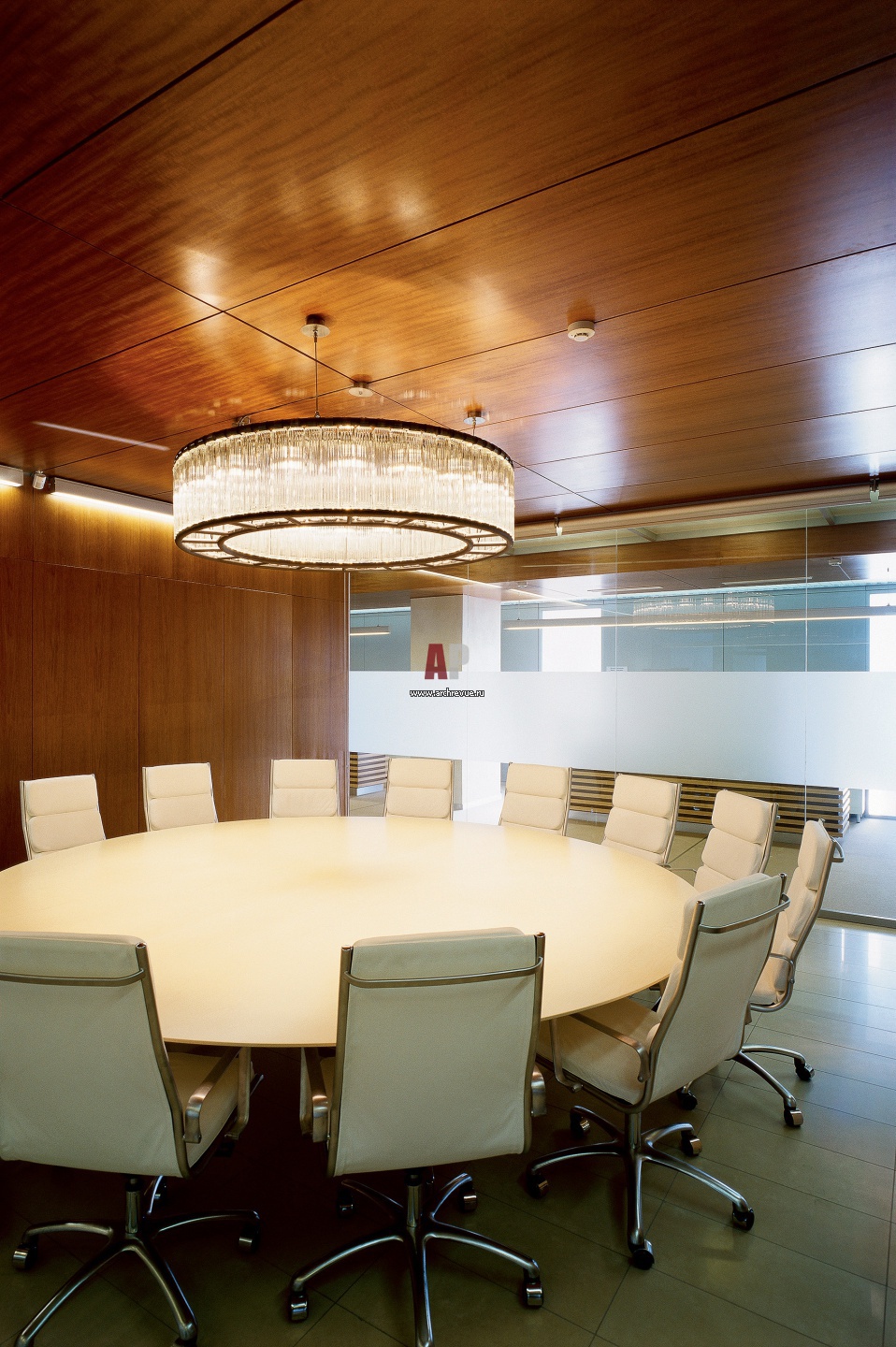 Интерьер переговорной с отделкой панелями из красного дерева и матового стекла. С круглым переговорным столом рифмуется радиусный потолочный светильник.