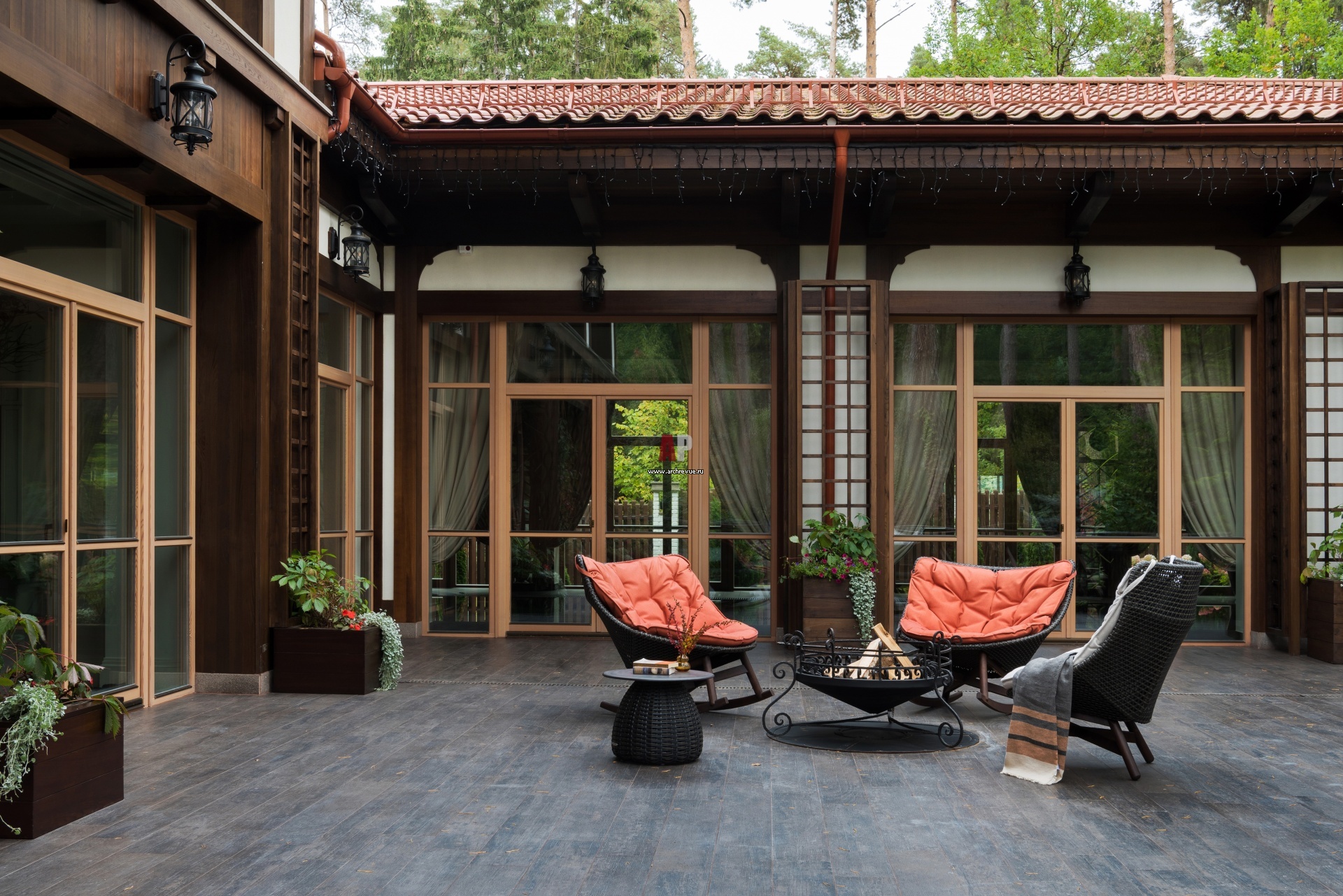 Открытая терраса. Декоративные элементы фасада выполнены из термодоски.