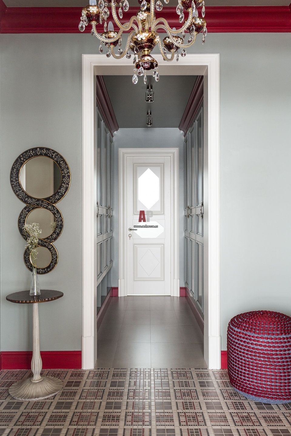 Интерьер прихожей. Стены выкрашены в нейтральный серый цвет. Плинтус, лепные карнизы сделаны красными. Дверь с зеркальными витражом создана по образу старинных дверей из особняка на Волхонке. На полу – плитка Jasba .