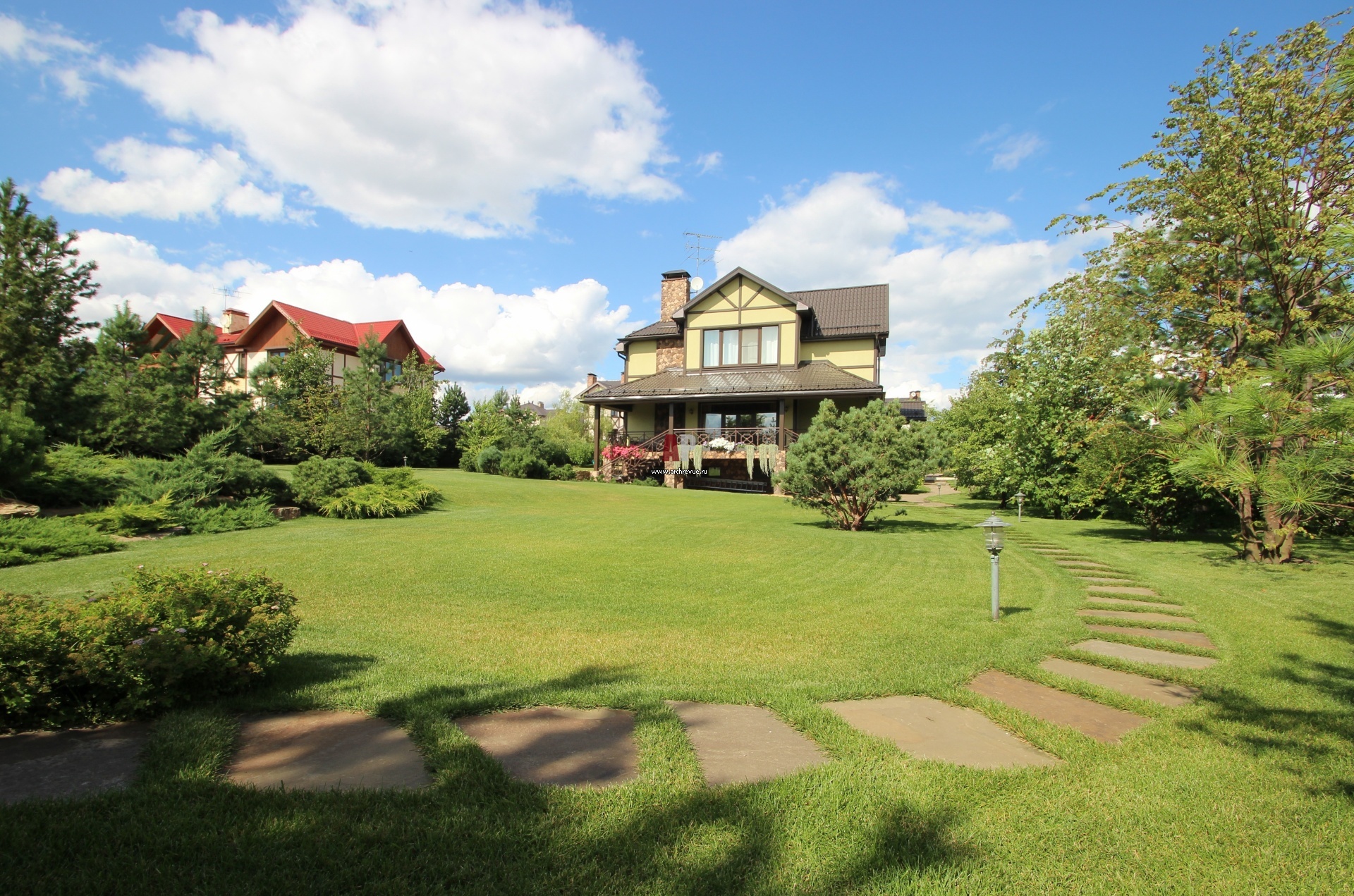 Значительную часть участка занимает плоский газон: раскинувшийся за главным фасадом он дает ощущение простора, выгодно масштабирует территорию, акцентирует архитектуру дома.