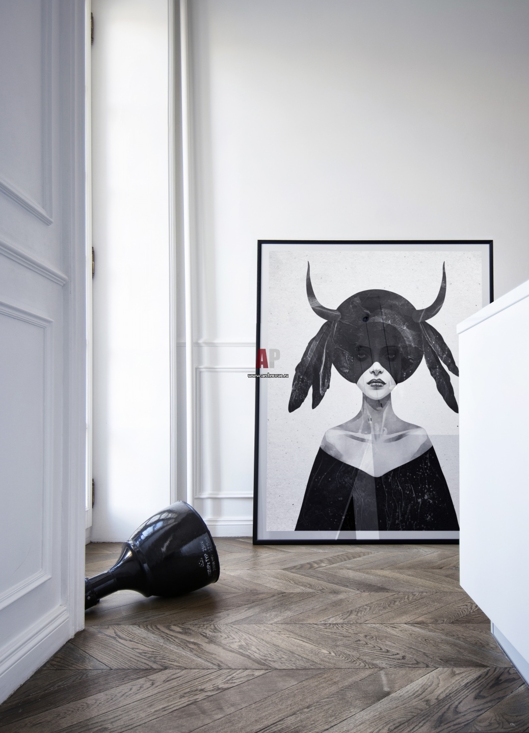 Черно-белая графика интерьера дополнена постерами с произведениями Рубена Айленда. Низ стен оформлен классическими буазери.