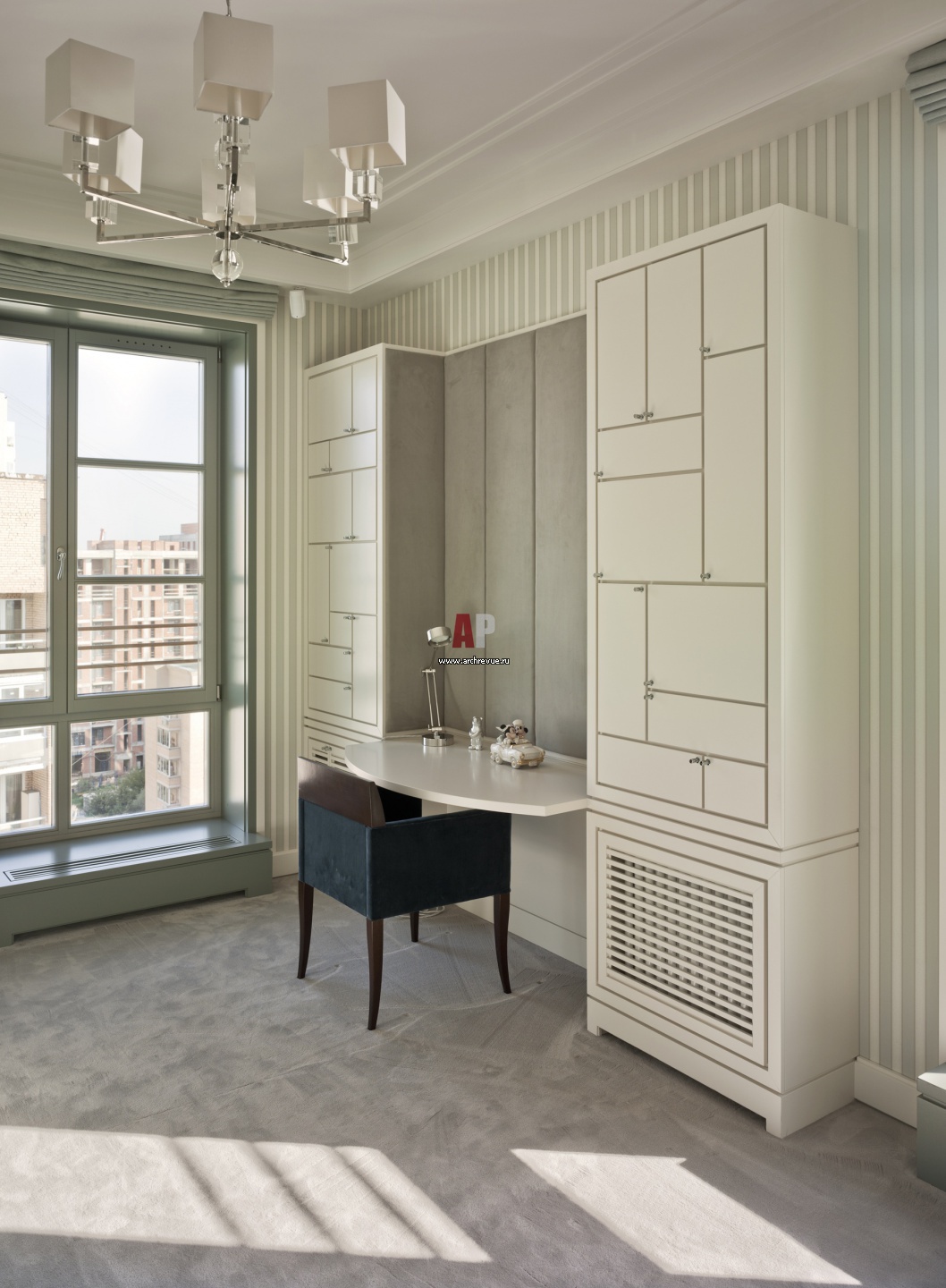 Мебельная композиция со столом сделана по эскизам авторов проекта. Фактура и цвет ковра рифмуется с обивочной тканью стеновых панелей.