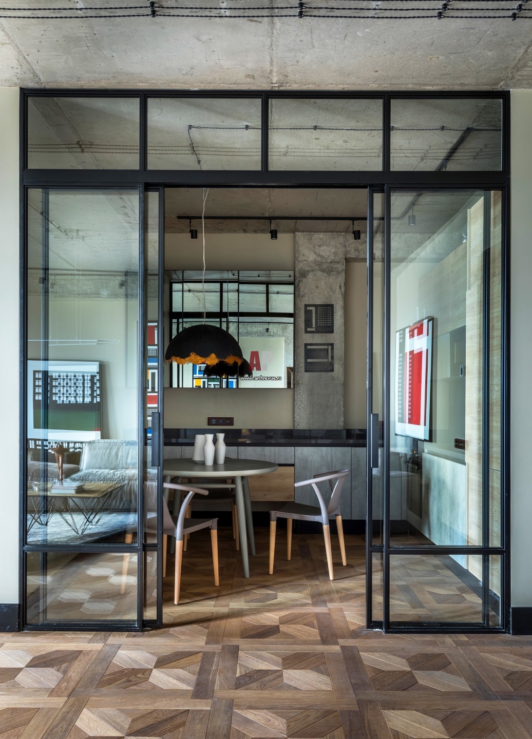 Кухня отделена перегородками из стекла на каркасе из черного металла. Фасады гарнитура оформлены «под бетон».