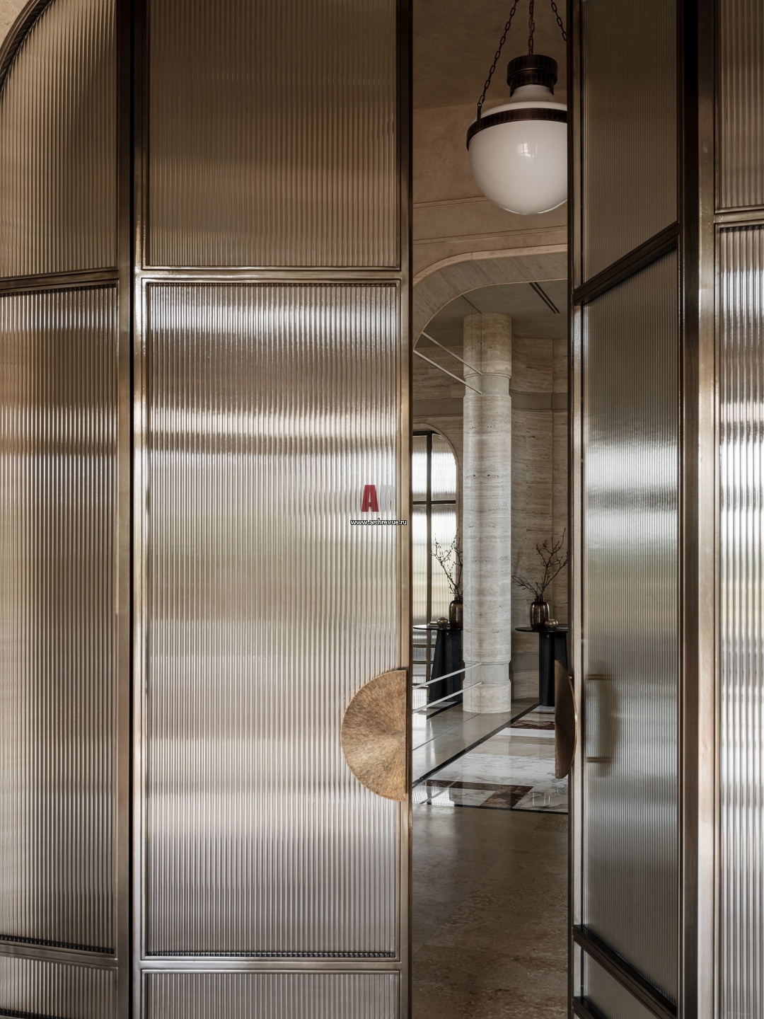 Стеклянные двери в металлическом профиле – индивидуальное изготовление по авторским эскизам. Металлические ручки выполнены из фактурной латуни.