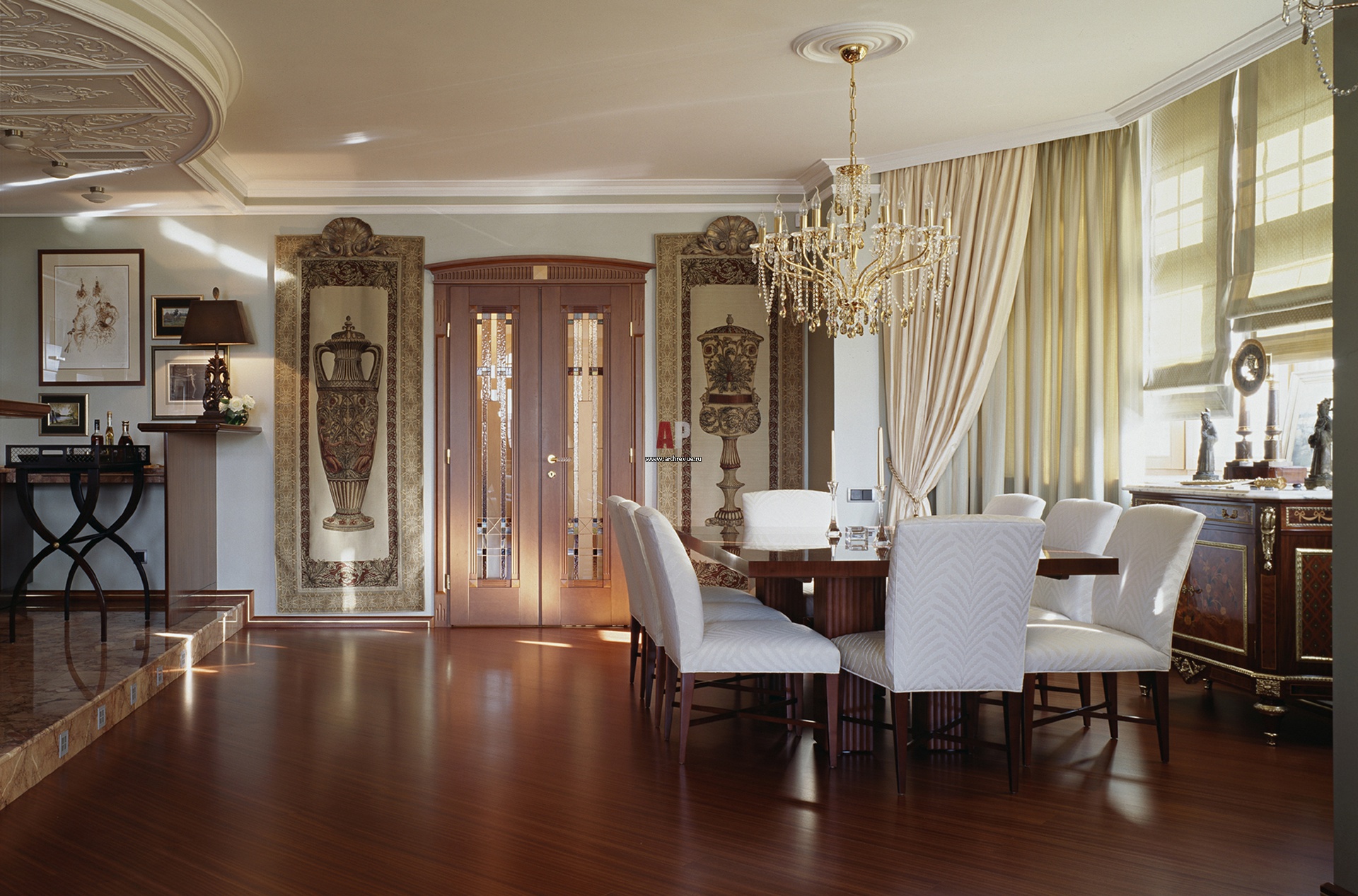 Из общей зоны авторы организуют выход в зону отдыха. Ее отделяют авторские двери, столярная мастерская «Алешин-студио» с витражами, выполненными в компании «Айрис-Гласс». А так же французские гобелены, обрамляющие вход.