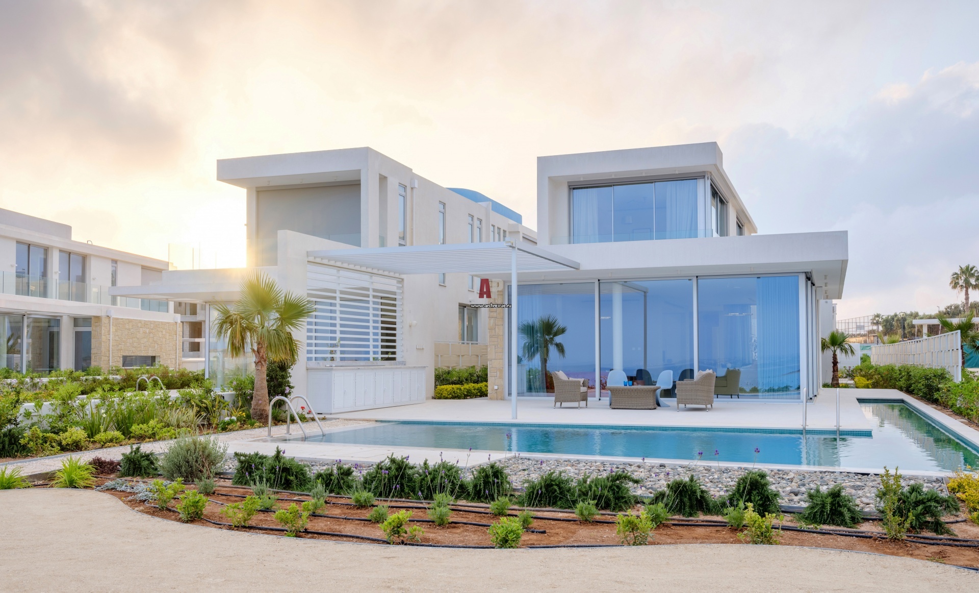 Дом для отдыха в курортном месте Корел Бэй (Coral Bay) на Кипре. Вилла с бассейном и обустроенным ландшафтом имеет типовую архитектуру в стиле застройки поселка.