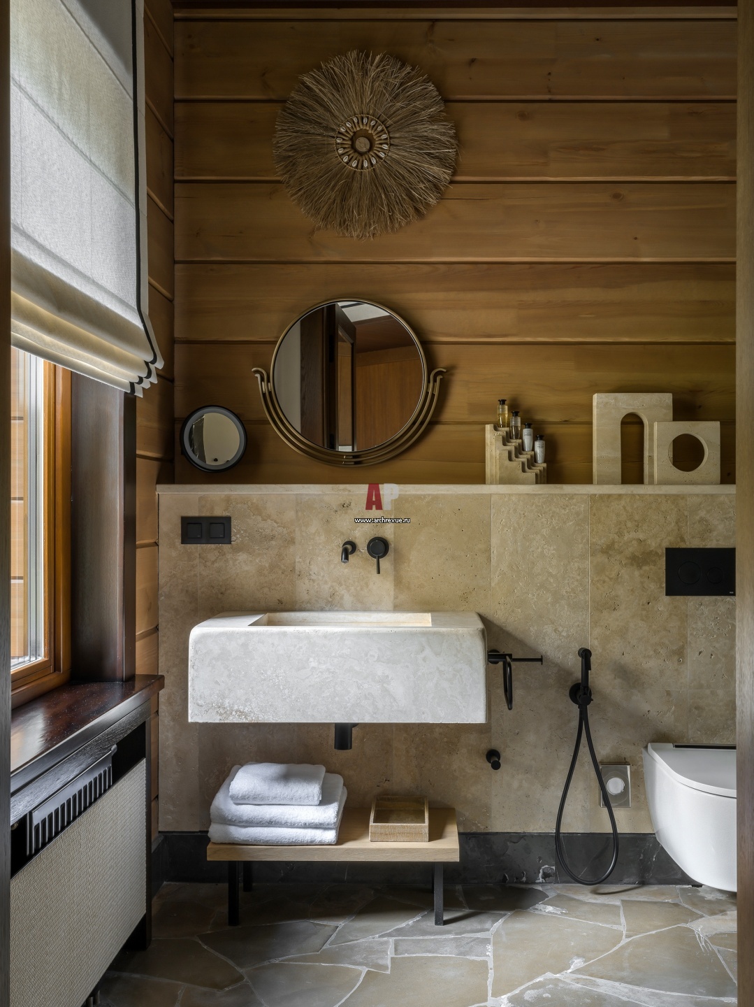 Санузел оформлен в стилистке альпийского шале с обилием природного камня. Раковина и обрамление умывальника изготовлены из травертина