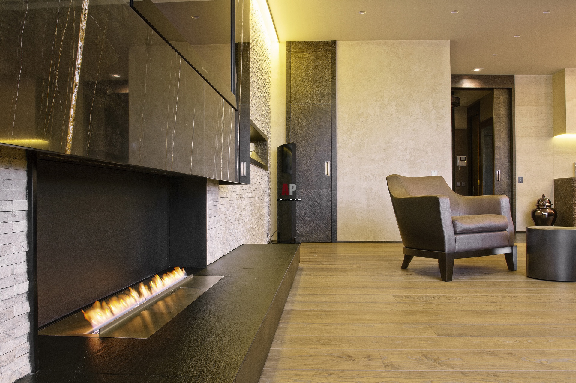 Зона камина в гостиной. Портал камина из черного мрамора. Топка камина, Planika.