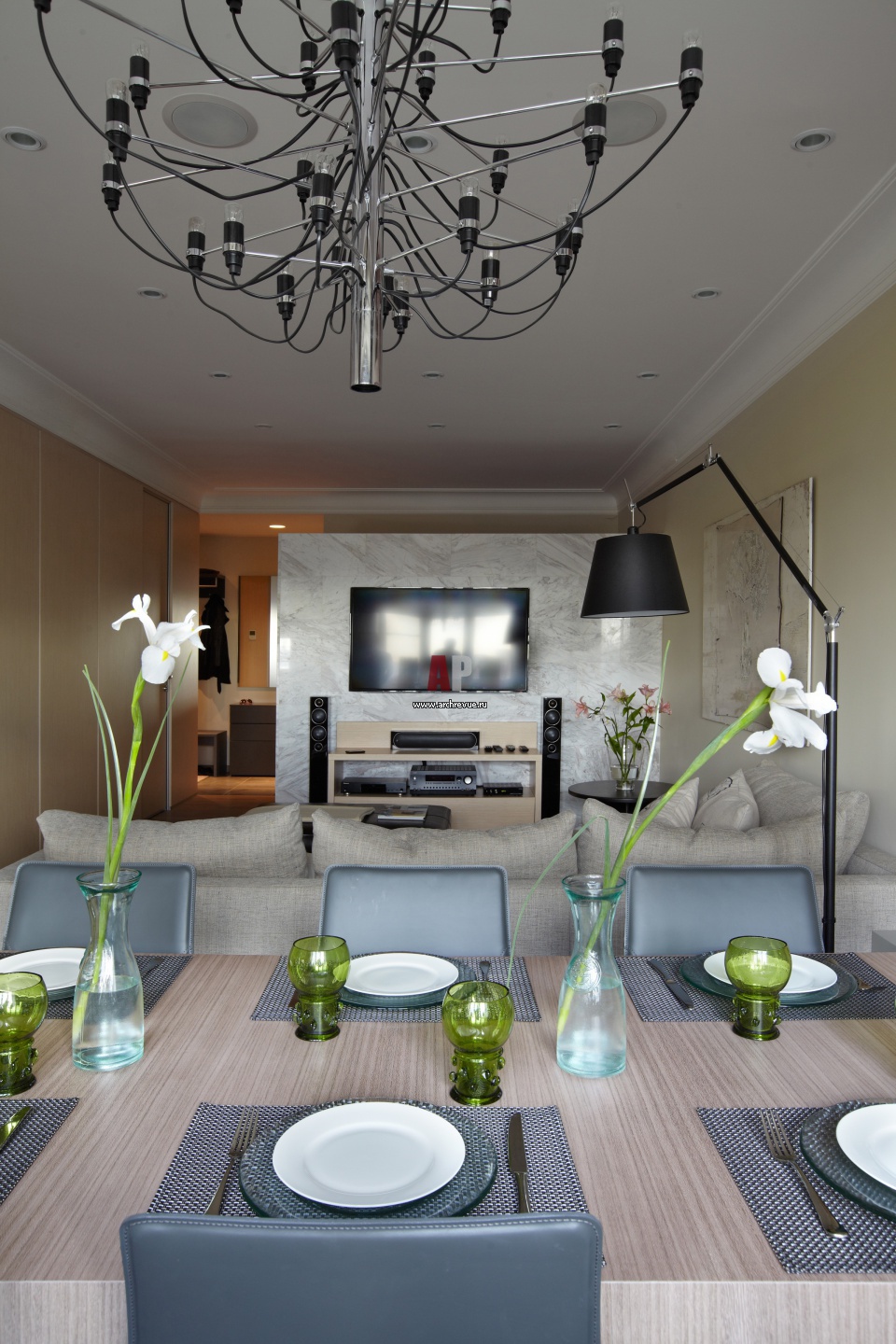 От прихожей гостиная отделена перегородкой, она облицована белым с серыми прожилками камнем и служит местом крепления ТВ. Встроенная и корпусная мебель, двери выполнены из древесины ясеня.