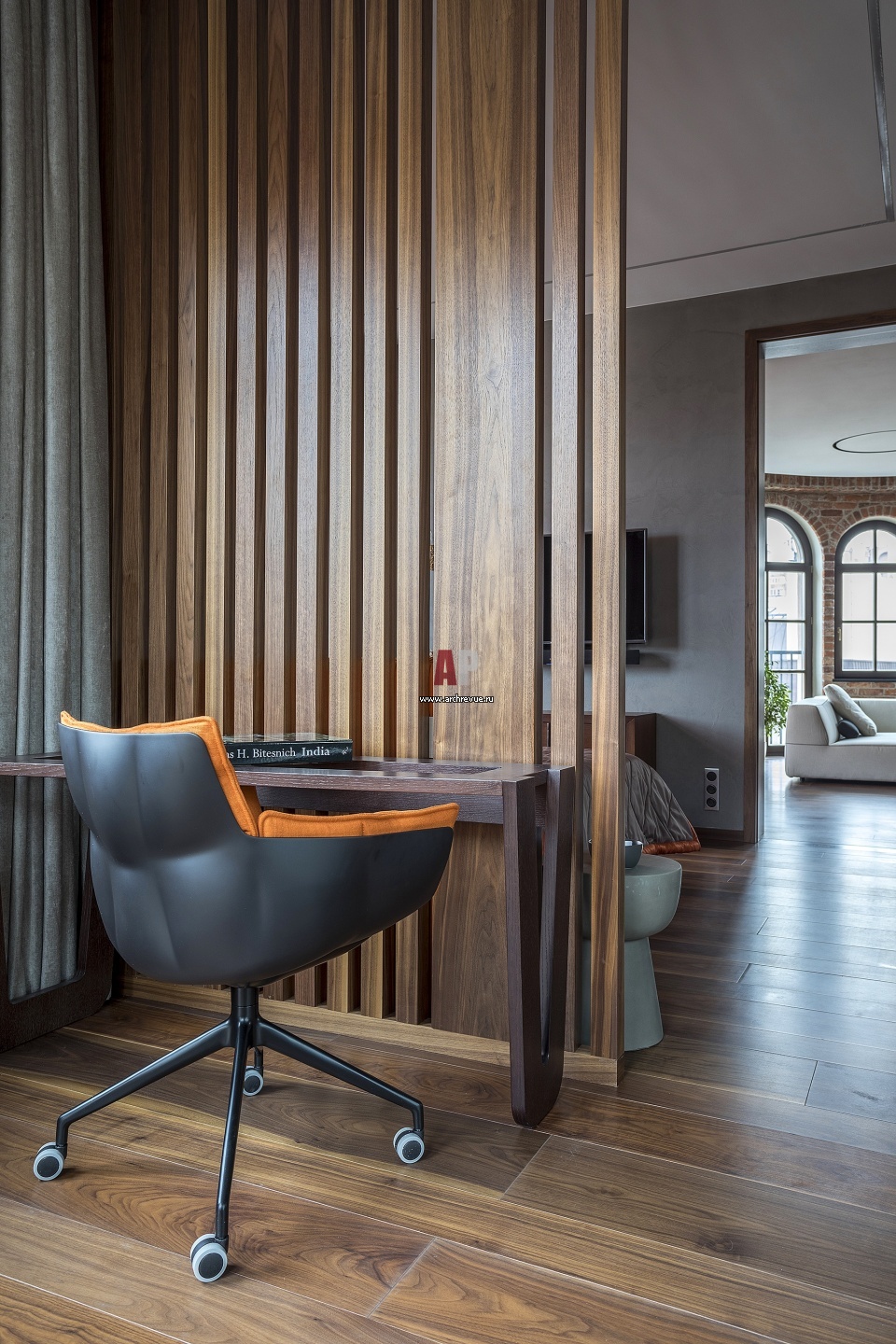 Стены, перегородка, полы из американского ореха. Кресло B&B Italia.