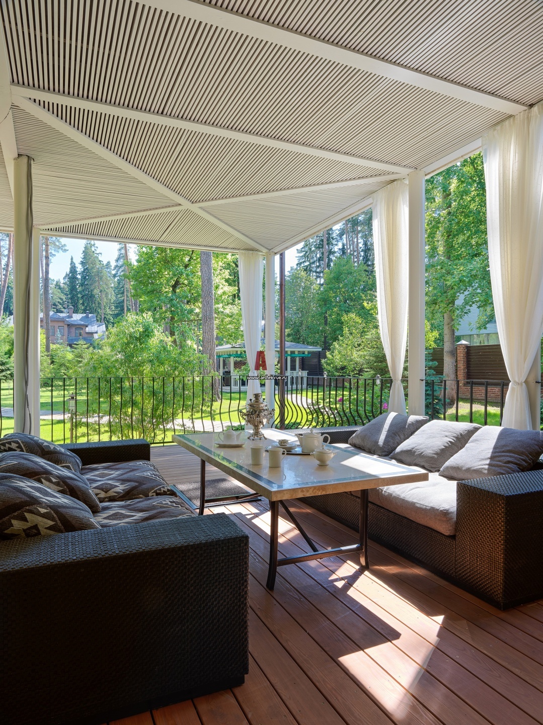 Обновление классического дома в Одинцово. Открытая веранда с диванами.