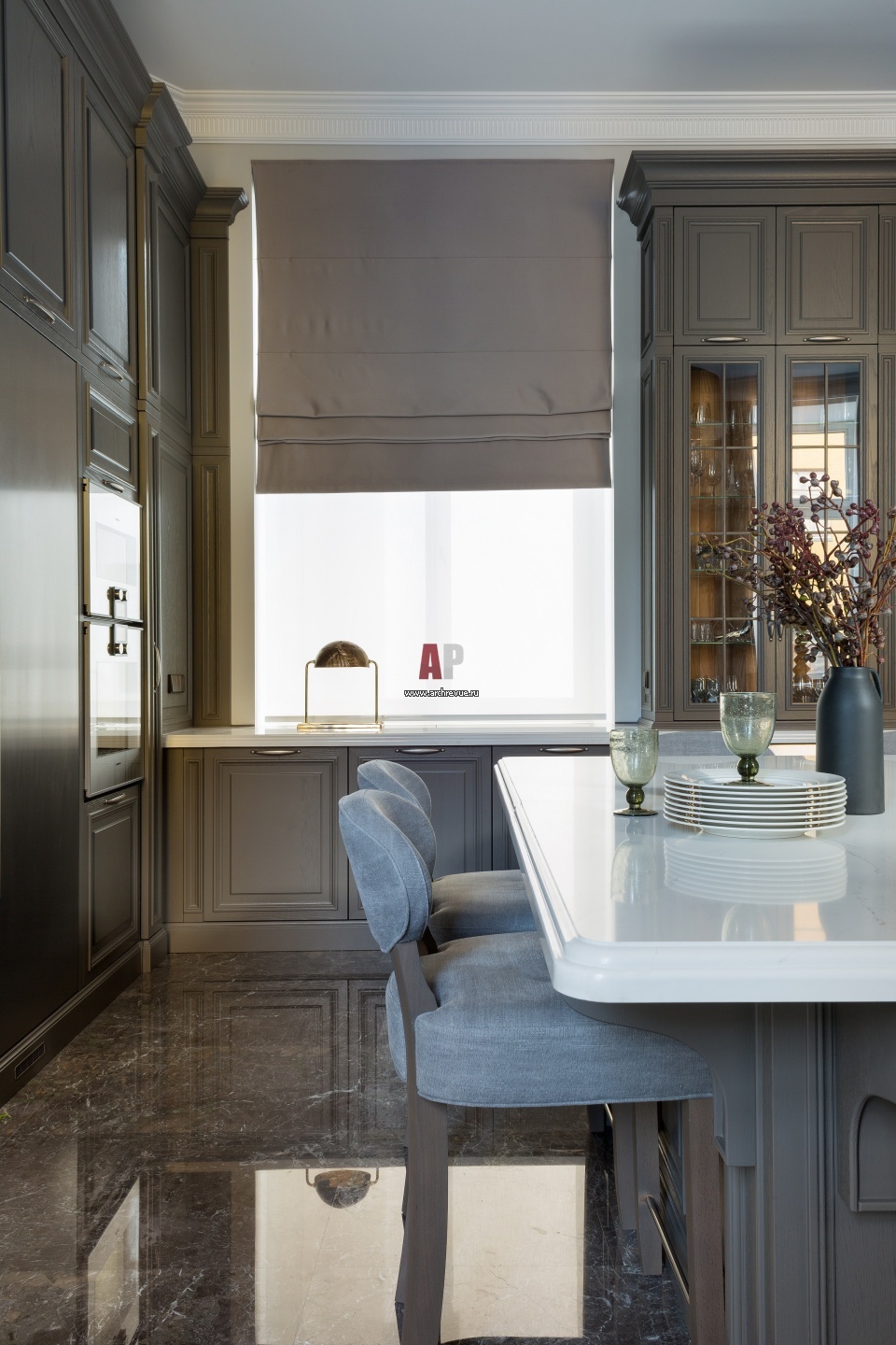 Интерьер кухни с окном. На полу – полированный мрамор. Барные стулья, Marie's Corner.