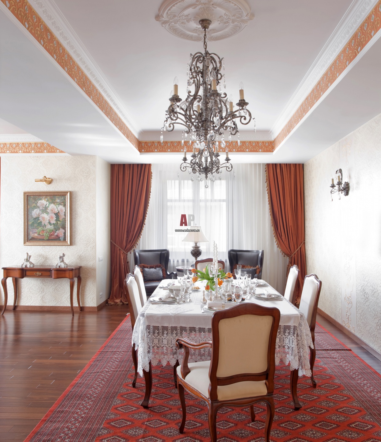 Обеденная зона в гостевом помещении первого этажа в классических традициях. Стулья из древесины ореха и бежевой ткани. Шторы насыщенного терракотового цвета сочетаются с красным восточным ковром.