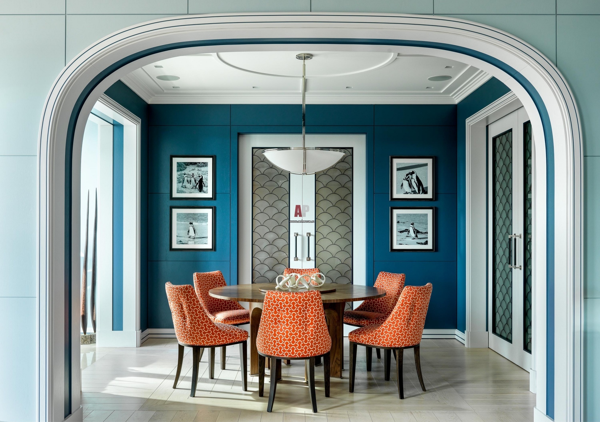 Гостиную и столовую объединяет широкий арочный проем. Раздвижные двери на кухню и в кабинет украшены художественными витражами в жемчужных тонах с эффектом «рыбьей чешуи». Обеденный стол из древесины ореха, на заказ. Стулья, Annibale Colombo в ткани Dedar. Люстра над столом, Boyd Lighting.