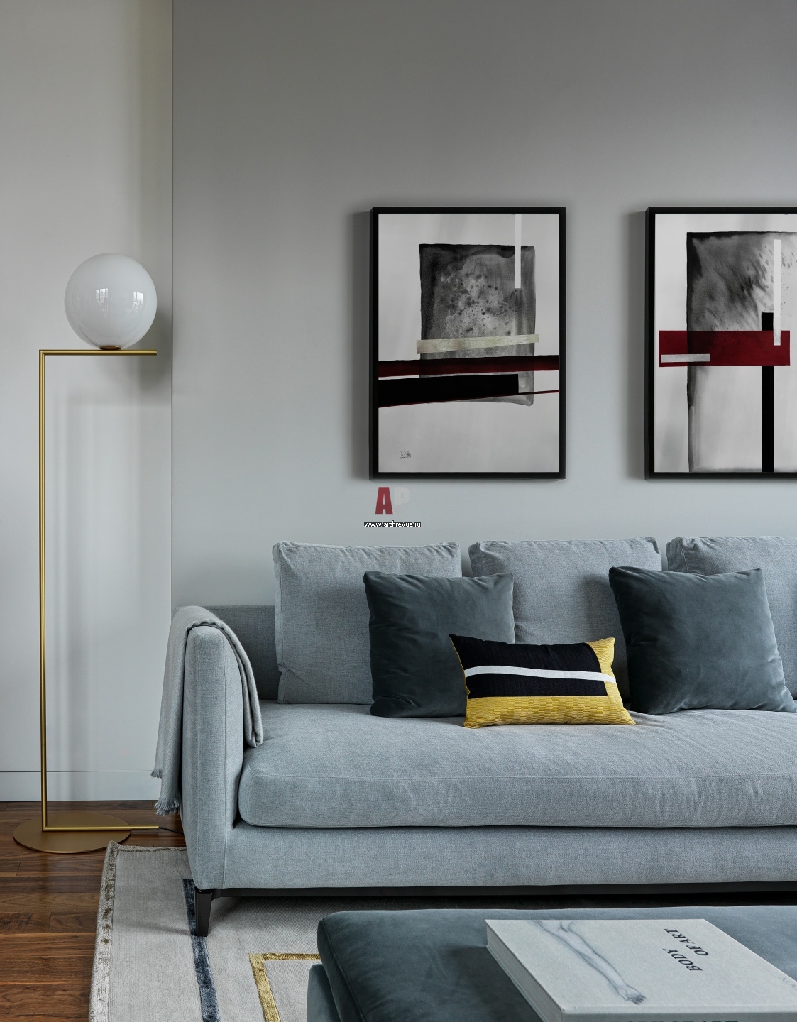 Спокойная квартира с серыми стенами. Интерьер гостиной. Диван, Minotti, модель Andersen. Торшер, Flos, модель IC Lights Floor. Графика – Мария Агаркова.