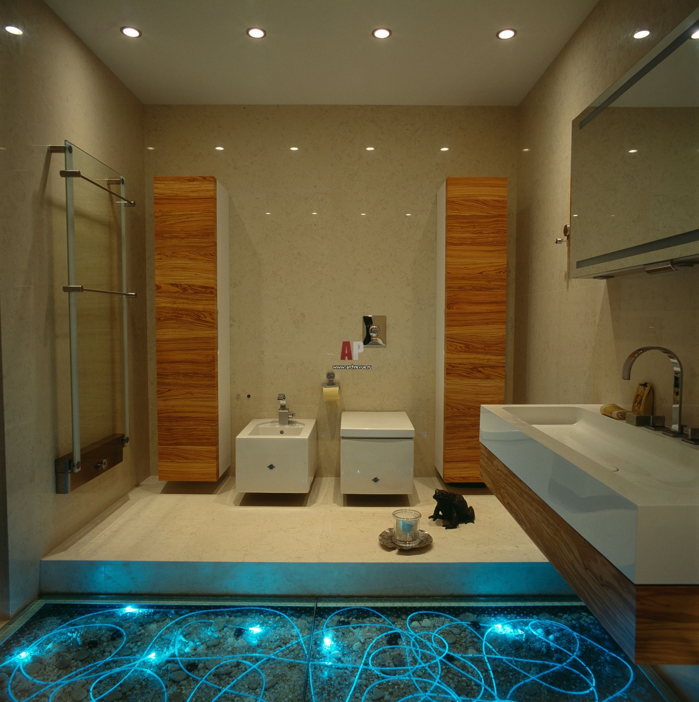 В оформлении ванной комнаты использованы светодиоды бокового свечения, они вмонтированы под стеклянным полом. Они загораются постепенно, а в процессе работы меняют цвет. Сантехника Duravit, раковина Keuco.