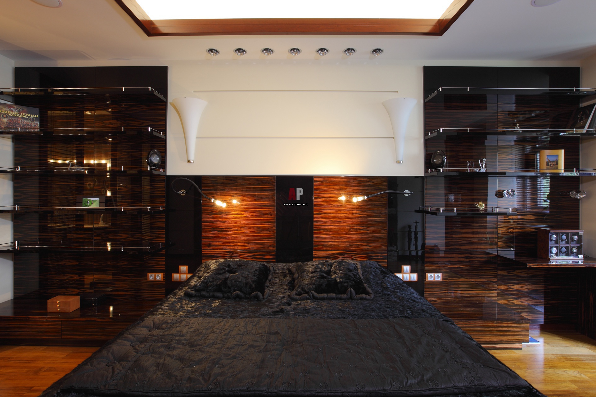 Спальня родителей в стиле ар-деко. Кровать, GC Colombo. Полки с двух сторон от кровати из зебрано под рояльным лаком.