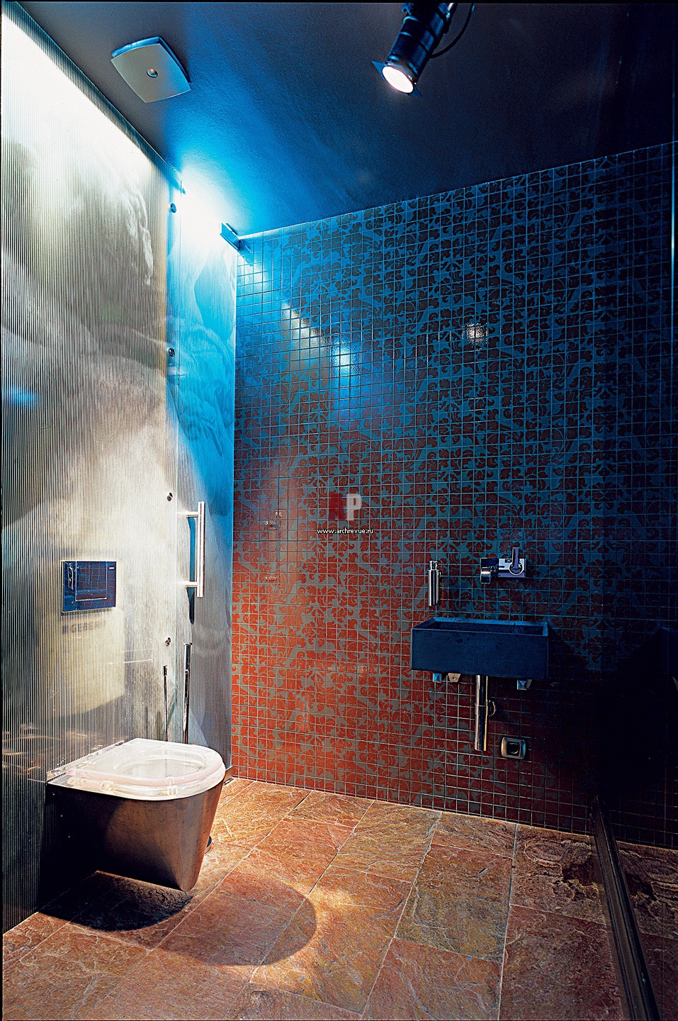 Тон в почти клубной комнате задает стеклянная ширма с принтом фотографии с изображением Гранд-опера. С ним сочетается плитка из натурального сланца на полу, поставщик GS ART, и мозаика с английским орнаментом на стене.