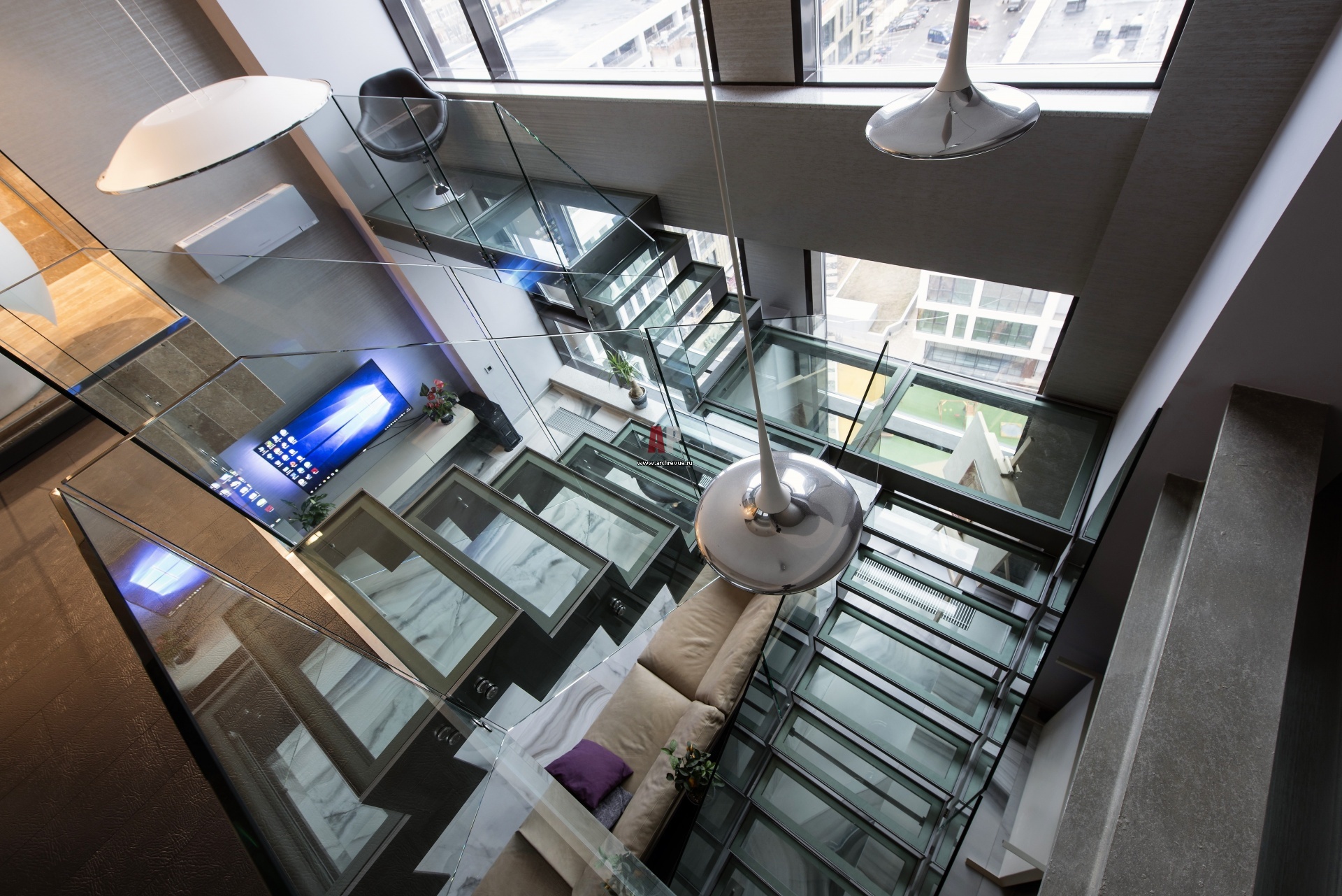 Лестница из стекла и металла имеет сложную конструкцию с центральной площадкой, откуда расходятся две пары ступеней: одни ведут в спальню на антресольном этаже, другие – на внутренний балкон с панорамным видом на город.