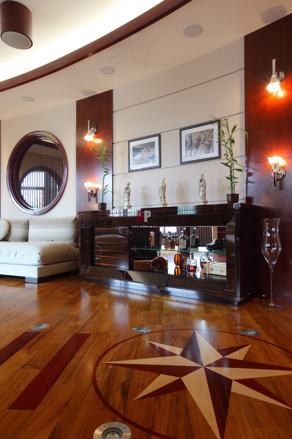 На полу – панно с изображением розы ветров. Паркет изготовлен на заказ, компания «Искусство в дереве».