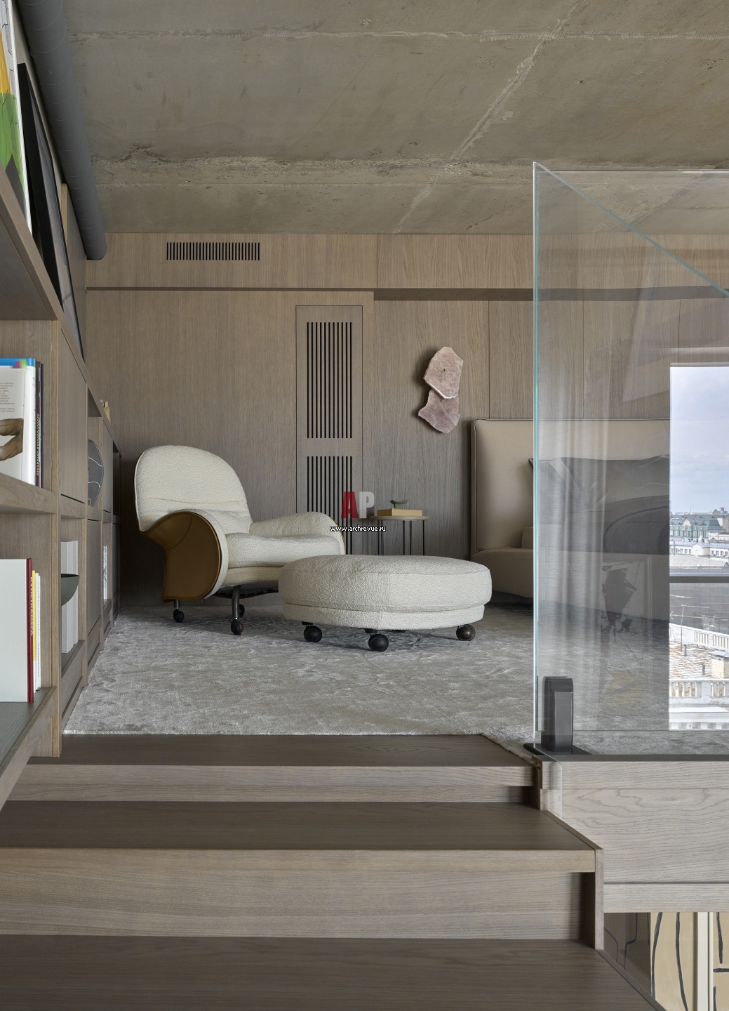Современная квартира-студия с антресолью. Вся встроенная мебель и лестница сделаны на заказ, седой дуб, изготовление – компания «Ассоциация русских мастеров». Кресло, De Padova.
