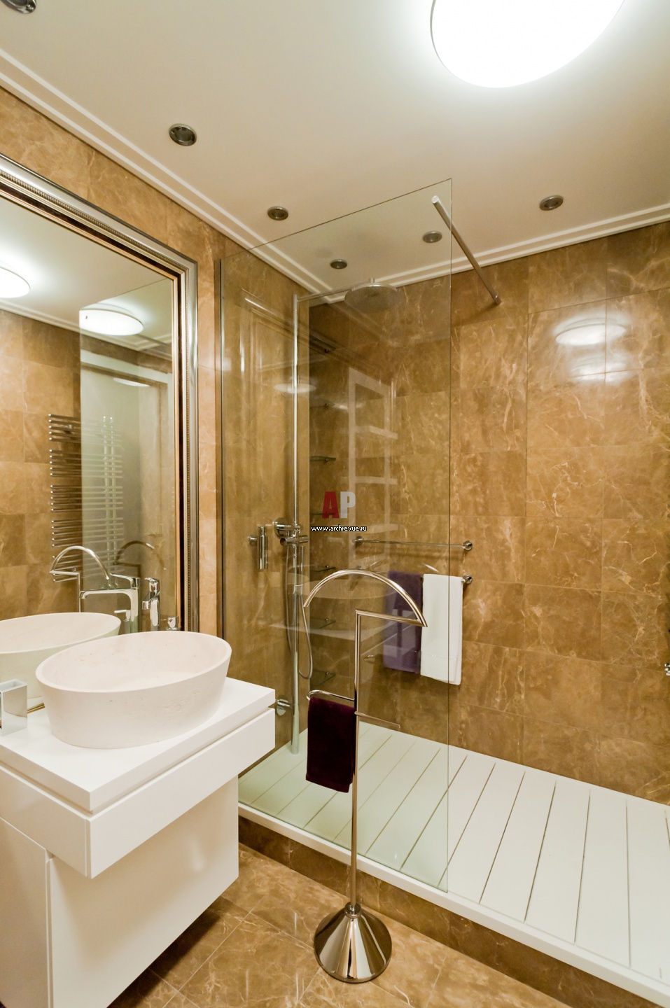 Два санузла размещены одним блоком и выполнены в одной стилистике. Но если в хозяйском установлена ванна, то в гостевом – вместительная душевая кабина.