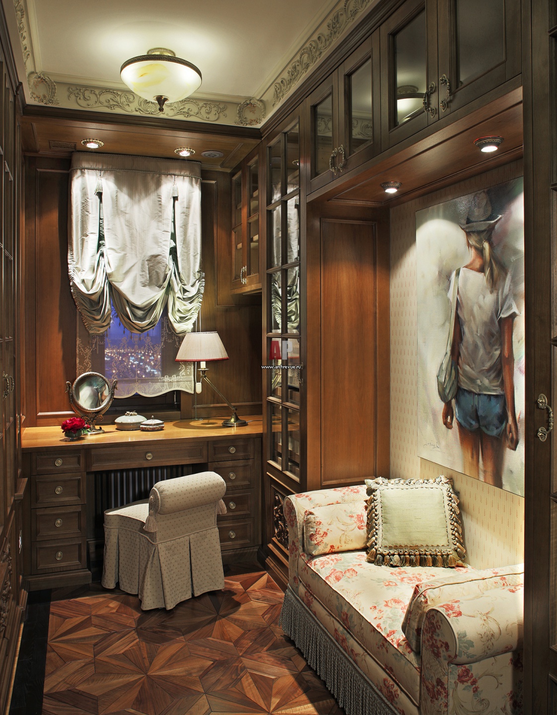 Фото интерьера женской гардеробной-будуара в английском стиле. Стеновые панели и шкафы из темного дуба. Белый резной карниз с рокайльными мотивами.