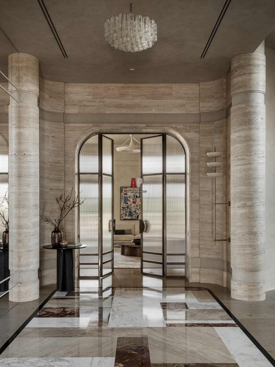 Пространство первого этажа выстроено по осям. Центральная ось объединяет парадные помещения и ведет от входной двери через лестничный холл в гостиную. На полу – мраморное панно, набранное из травертина и нескольких видов мрамора. Его геометрический рисунок был разработан специально для проекта.