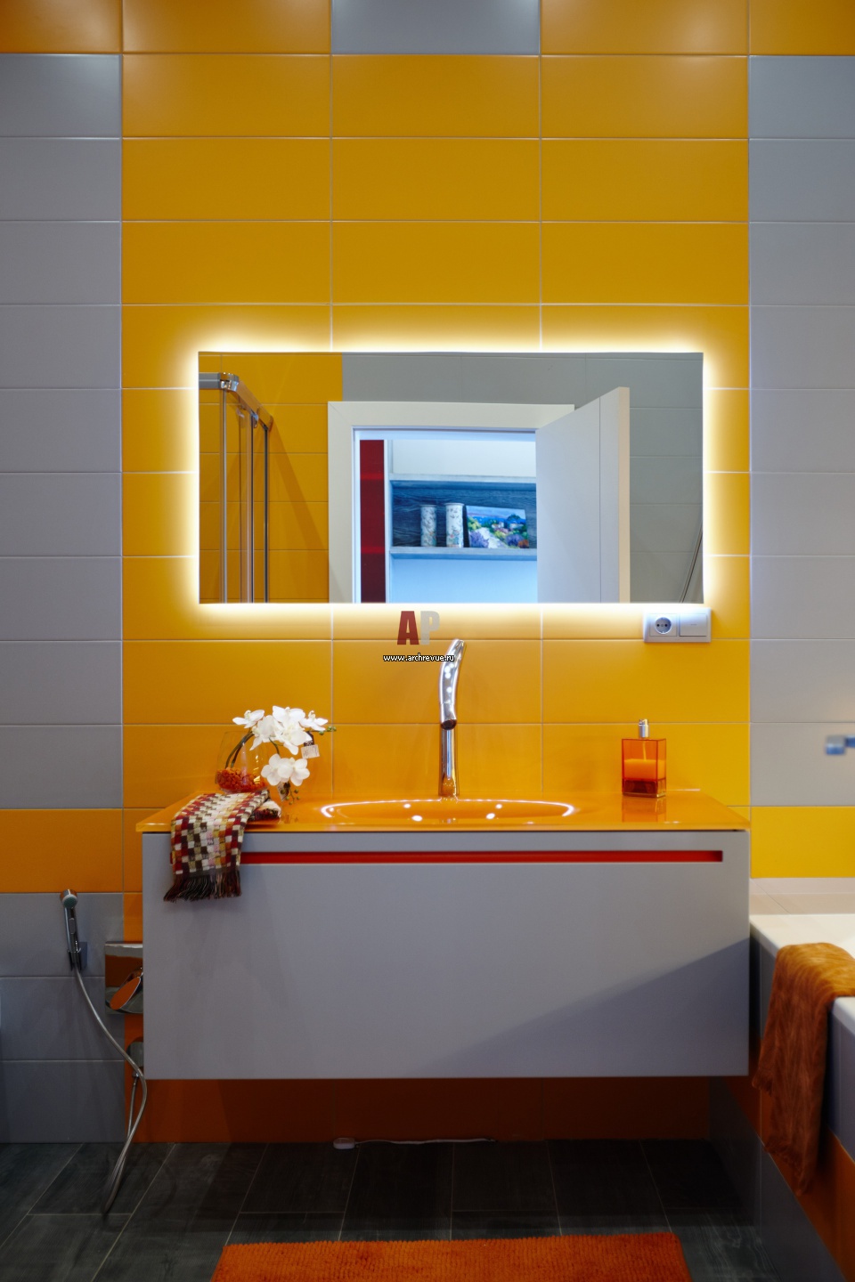 Детский санузел выглядит ярко за счет оранжевой плитки и сантехники, а также теплой контурной подсветки.